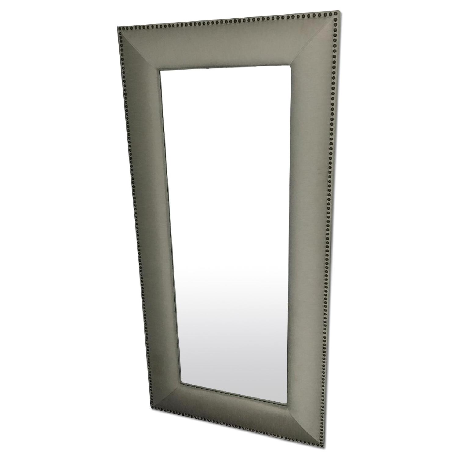 Seller's Notes:Gorgeous Linen wrapped Mirror with nailhead trim at the edges and bevels. Has also Horizontal dual Hanger bracket. Color : Ivory Material : Linen & Polyester Overall Frame: 34.5"W x 70"H x 1"D Interior Mirror : 21"W x 27"H