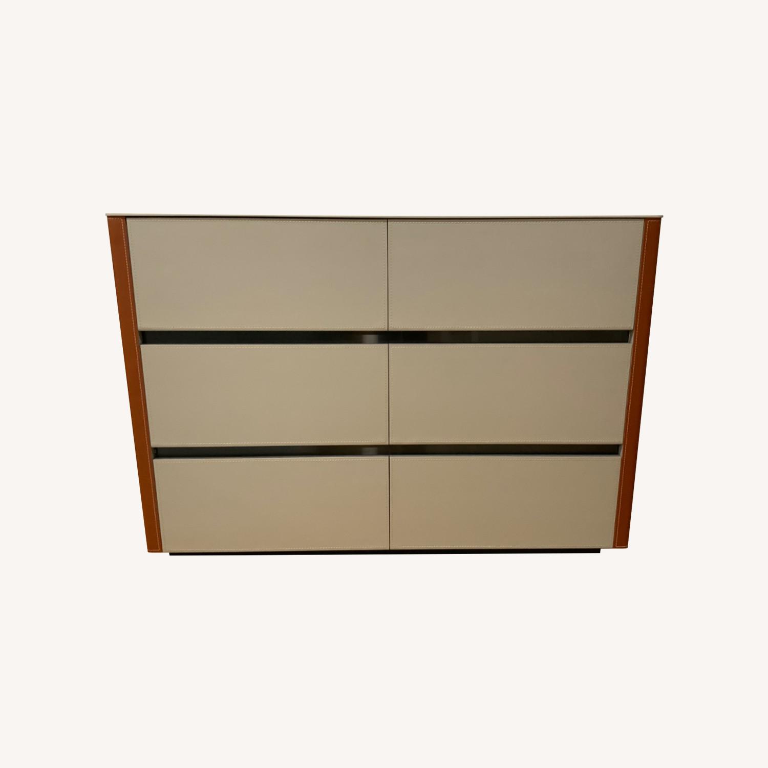Seller's Notes:Color is “Light Khaki”. Solid wood structure (light gray stain) with tan leather-like covering on drawer fronts and orange/rust on sides. Drawers have rust-colored leather-like covering on bottom of drawer. White with grey veining stone top. Like new - less than a year old. There are no blemishes and it hasn’t been used. Bought online after we remodeled, but the style doesn’t work with the rest of our house and I could not return it.