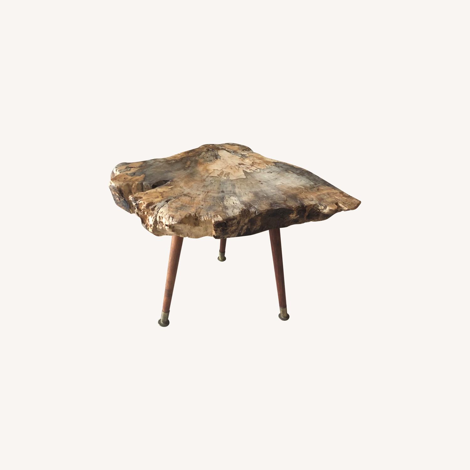 Seller's Notes:Lucious burl wood live edge coffee table. Bring the outdoors in? Features vintage tapered wooden legs and mesmerizing wood grain. Treated with a poly satin finish. Great Nakashima inspired design to mix and match with a varitey of decors. Meaures approximately 25" across x 21" deep x 17" tall.