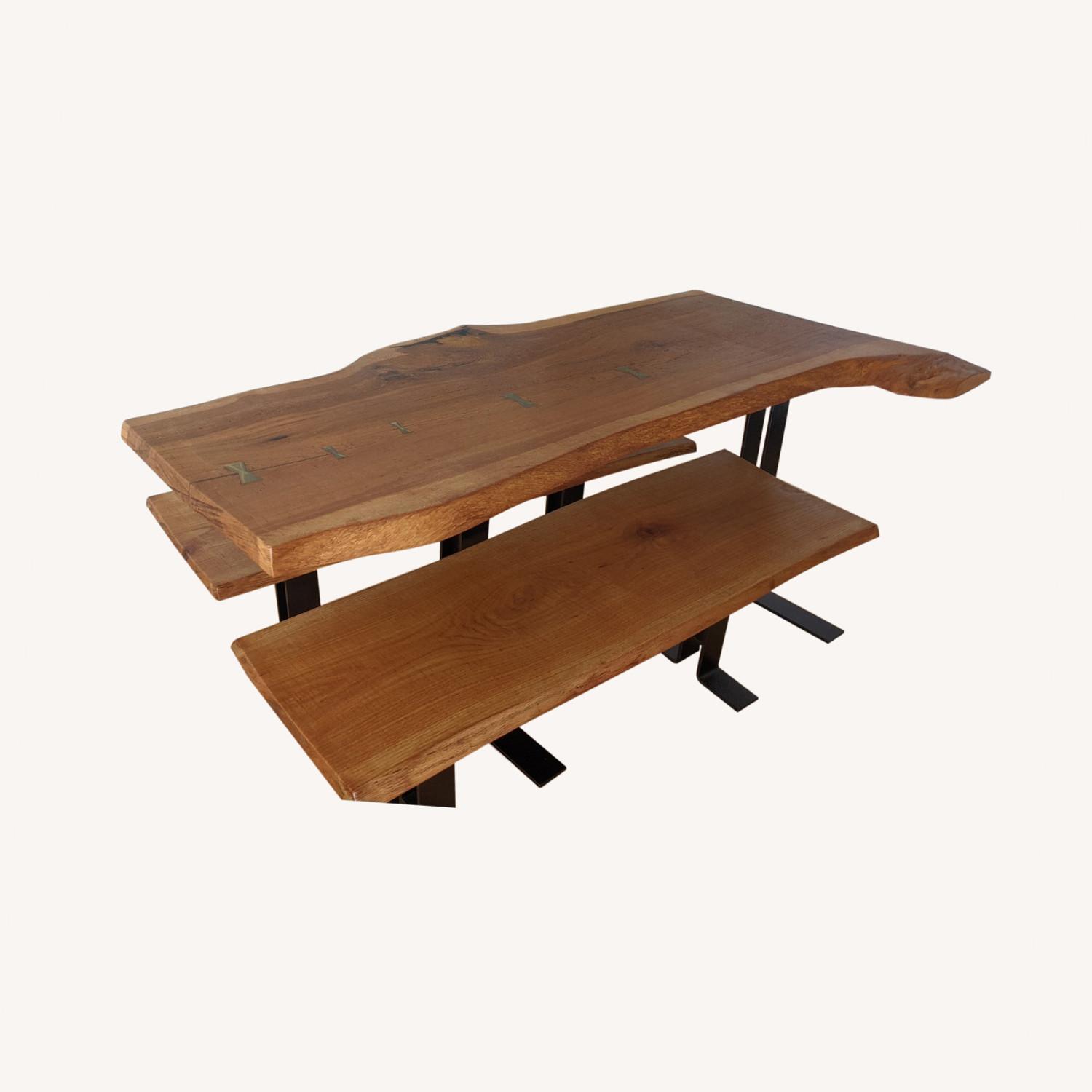 Seller's Notes:This lovely 1 & 3/4" thick single slab of American white oak with live edge was transported from a lumberyard in Hartsdale, NY to a warehouse loft in Brooklyn, NYC where the raw materials were transformed into a gorgeous dining table that can comfortably seat 6 guests. The powder coated metal legs are fastened to the table with 3/8" threaded lag bolts using threaded brass inserts for easy assembly/disassembly. Approximate measurements 63" length x 30" height x 22" - 32" in width The slab is finished with 8 coats of Real Milk Paint Co. tung oil and citrus solvent to lovingly protect the table from moisture, while at the same time allowing the natural beauty of the wood grain to show through. 5 solid brass butterfly inlays are merely for aesthetics, as the natural splits and gaps in the slab have been filled with clear epoxy. Just the raw materials cost over $3500 not including 50+ hours of labor. Similar tables retail over $8000. 2 matching benches from slabs of the same tree are also included with purchase. Can also include 4 chairs - two purple and two gray (shown in one picture) upon request.