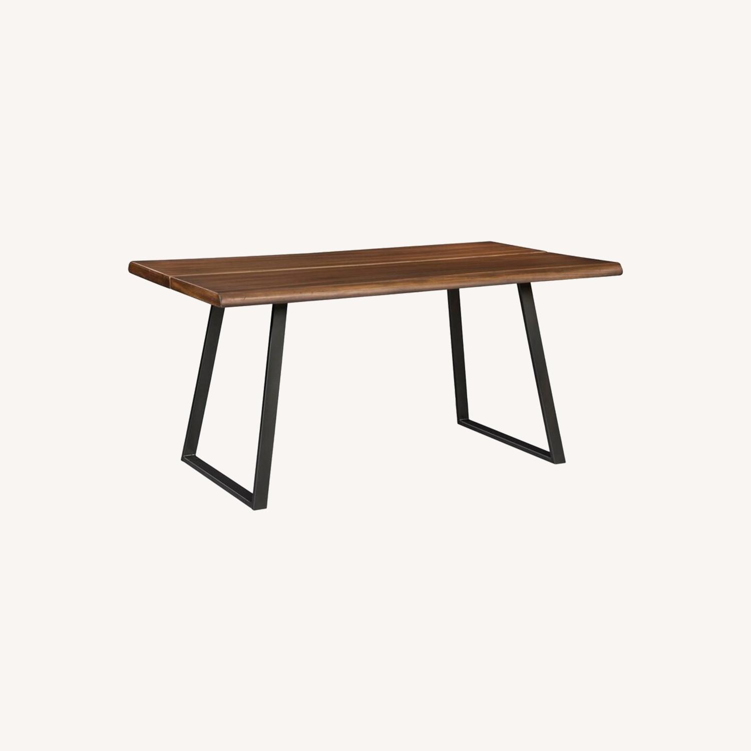 Seller's Notes:Moving and cannot take this beautiful table with me. Less than one year old, has a very minor crack that is very unnoticeable (see pictures). Features The top is divided into 2 parts for ease of assembly Live Edge (Natural edge of the wood that’s been incorporated into the design.) Eco-friendly - Made of 100% solid pine Wood from renewable forests from Southern Brazil Product Details Top Material: Solid Wood Base Material: Metal Top Color: Light Oak Base Color: Gun Metal Seating Capacity: 6