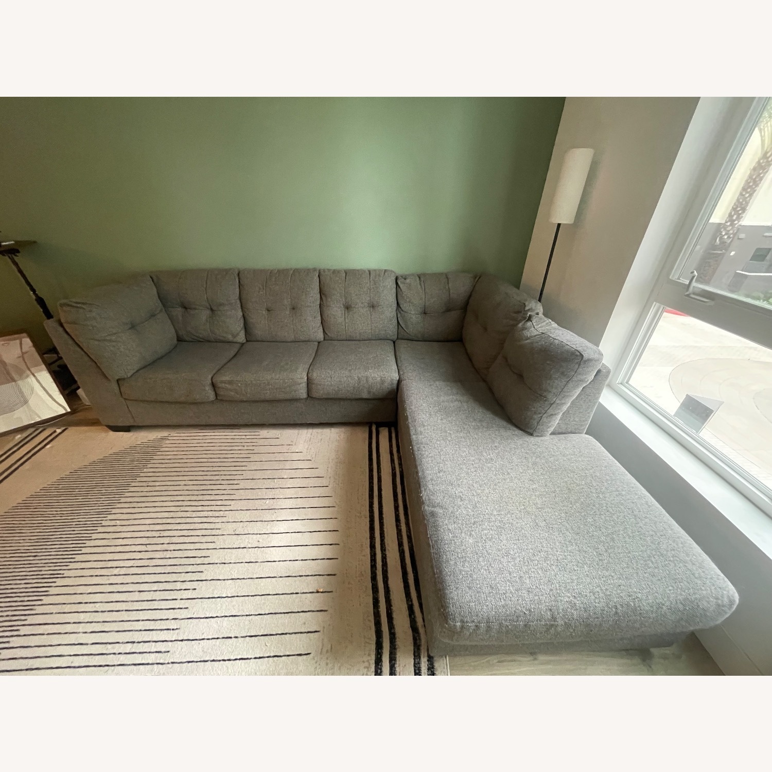 Seller's Notes:Modern gray L-shaped sectional in very good condition. Neutral color and clean design that works in any living room. • Comfortable and supportive cushions • No rips or major stains • From a smoke-free home • Great for apartments or family rooms Only selling due to upcoming move.