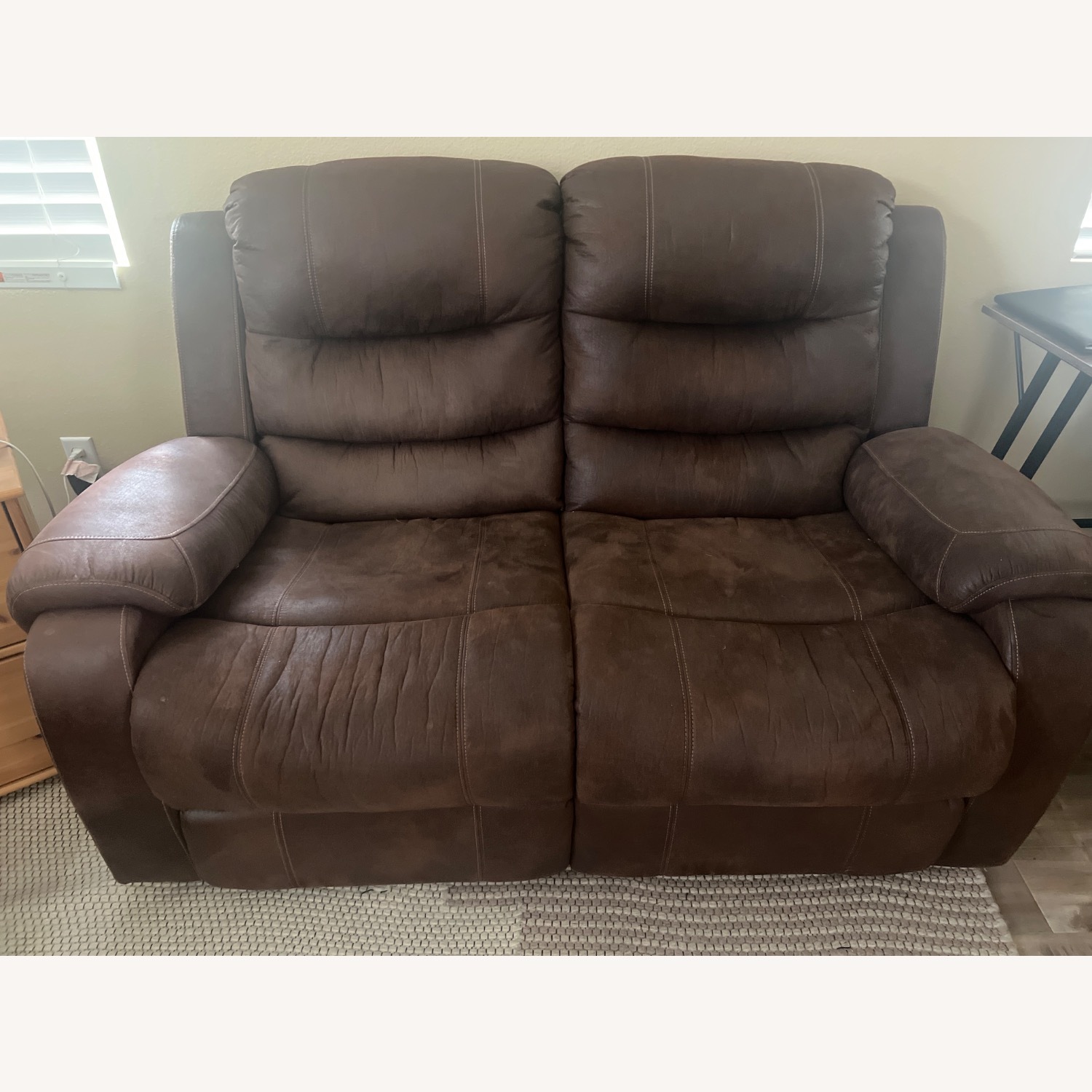 Seller's Notes:Brown suede reclining love seat in fair condition. Has a few stains from dog and kids but can be easily cleaned by professional upholstery cleaner. In pretty decent condition for being 9 years old. Pick up only. Smoke free home.
