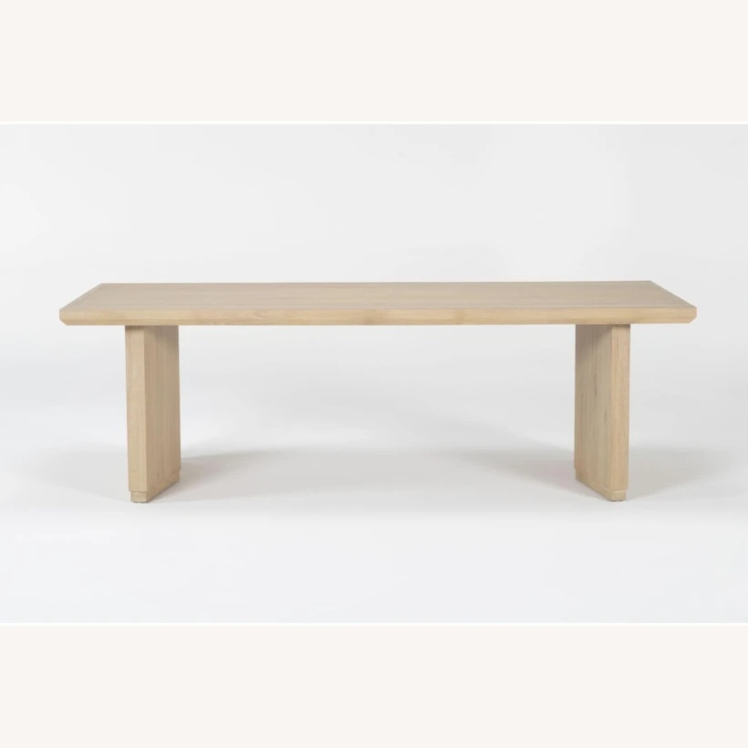 Elevate your dining experience with the Voyage Natural Beige Wood 94" Rectangular Trestle Dining Table by Nate Berkus + Jeremiah Brent. This modern dining table features a stunning sun drenched oak finish, offering a natural and inviting look to your dining room. Crafted from knotty white oak veneer and solid hardwood, this table combines durability with a touch of sophistication.