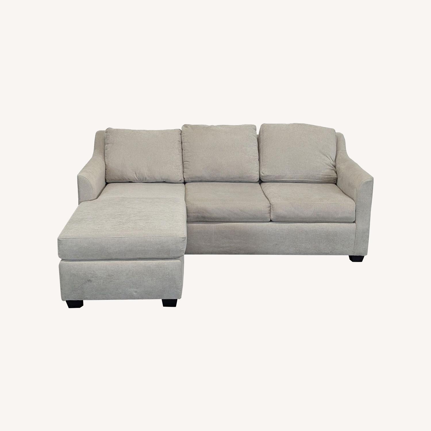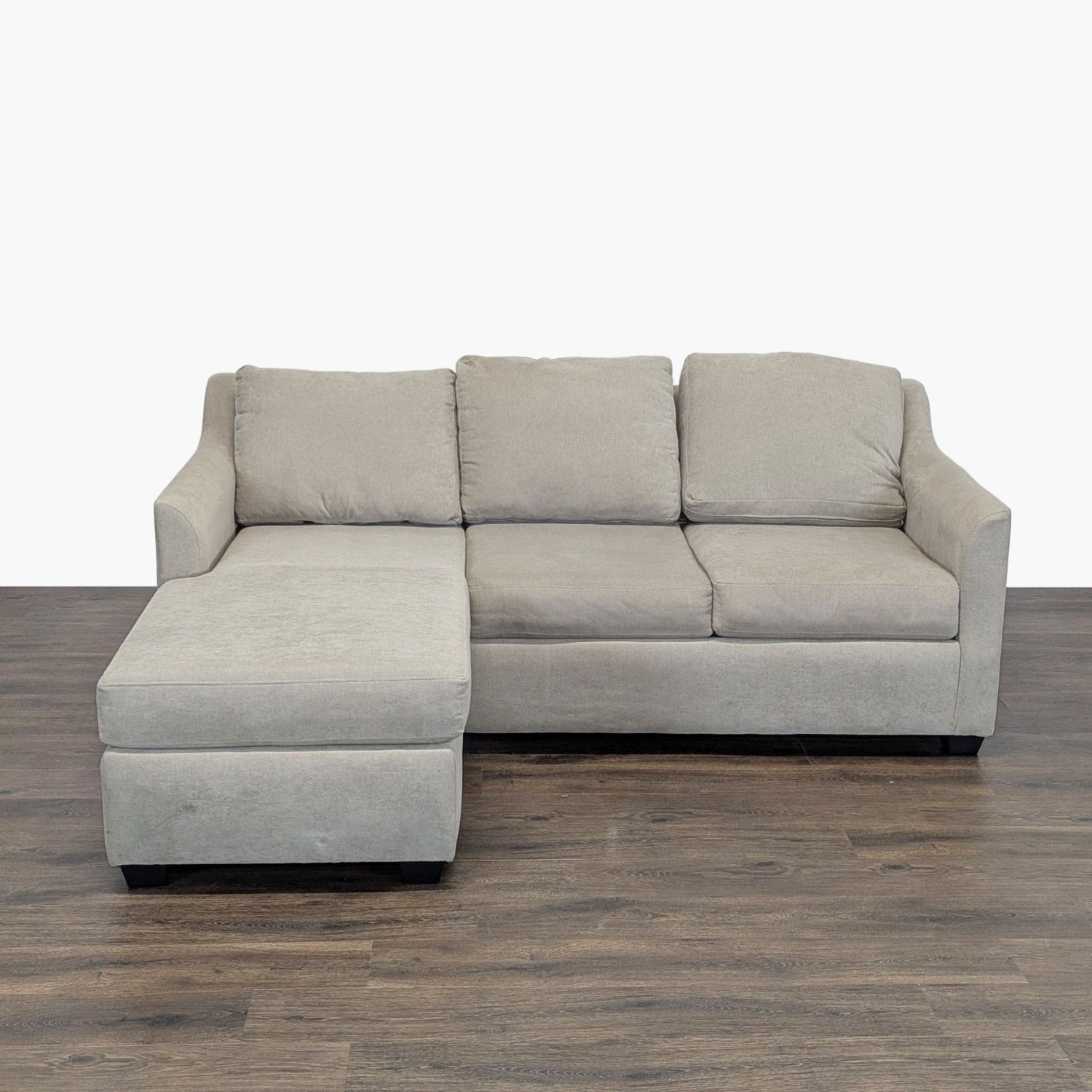 Seller's Notes:This Living Spaces 3-seat sectional sofa features a modern beige fabric and a spacious chaise for comfortable lounging. Its sturdy build and soft cushions make it ideal for any living room. The neutral tone matches well with any decor.
