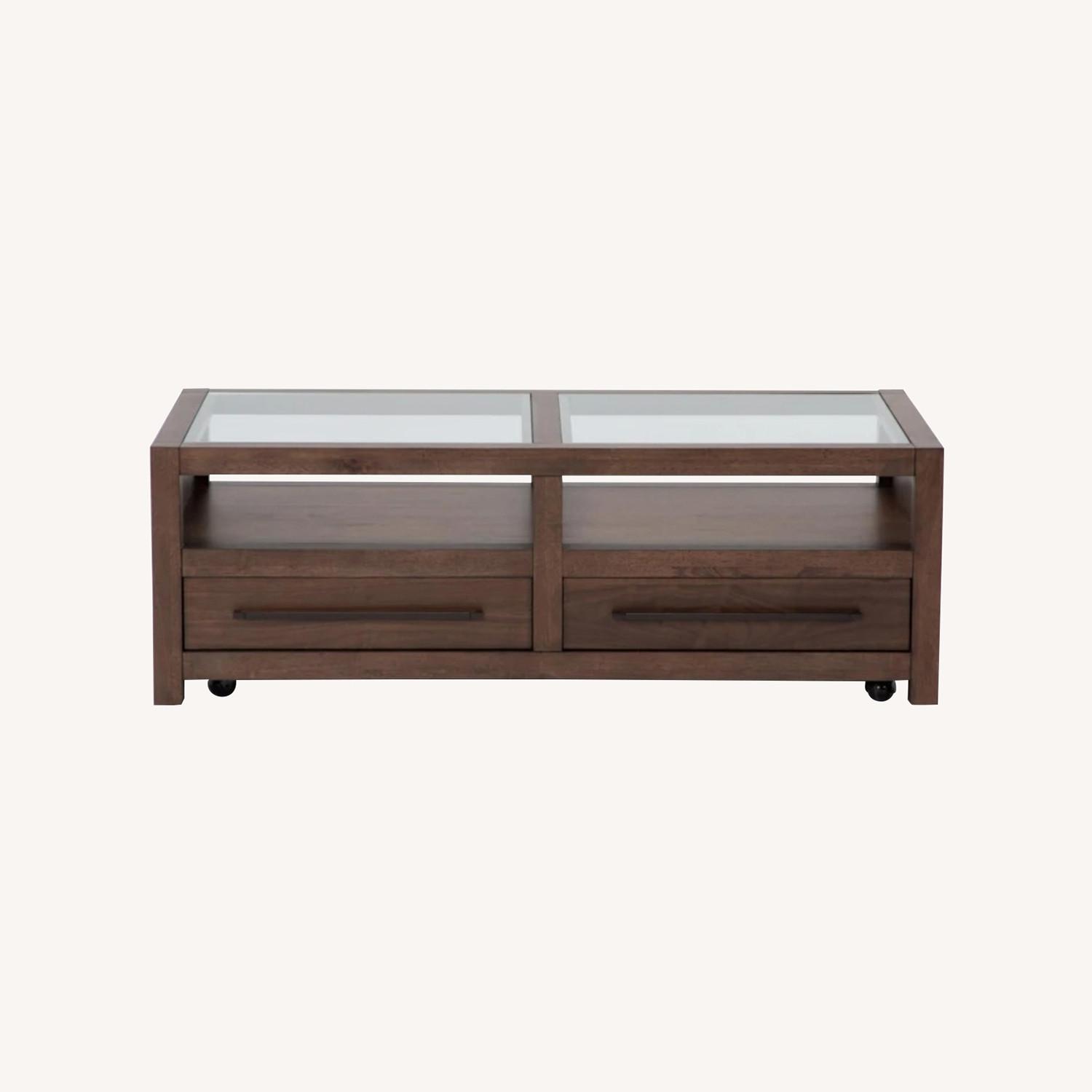 Seller's Notes:The Sawyer Brown Walnut 54" Wide Rectangle Glass Top & Wood Base Coffee Table is a stylish addition to any living room. The modern design features a walnut finish with a combination of walnut veneer, solid rubberwood, and a glass top. It offers ample storage with drawers, shelves, and wheels for easy mobility.