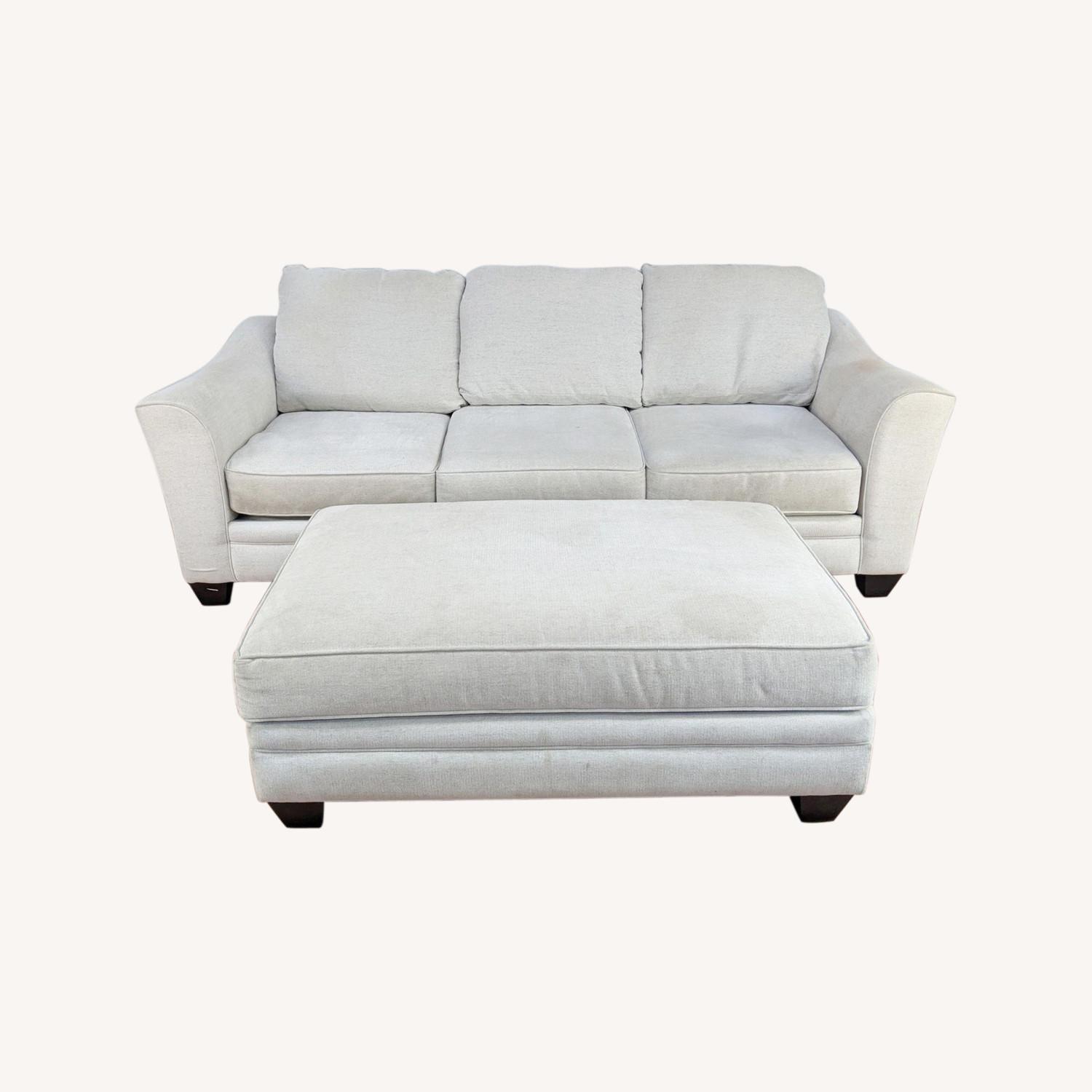Seller's Notes:Ivory Chenille Sofa With Flared Arms And Matching Ottoman. Brand: Living Spaces. Dimensions: 95x26x31.