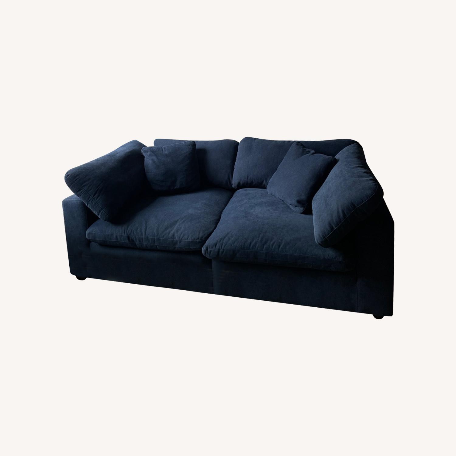 Seller's Notes:Sold out Living Spaces “Zone” couch in gorgeous navy blue. Purchased for $740 and used for less than a year - loved this couch, but can’t take with me.