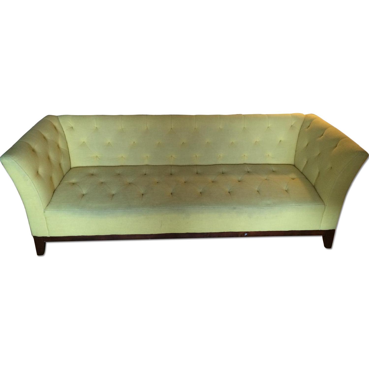 Seller's Notes:Elegant and unique - tufted yellow sofa in a Modern Chesterfield design. Very comfortable and sophisticated. Cushions are in terrific bouncy quality, no bowing or indentations. Solid, one piece cushion, with sturdy linen fabric, great for children. Slight signs of use but otherwise great condition. Legs are detachable if needed.