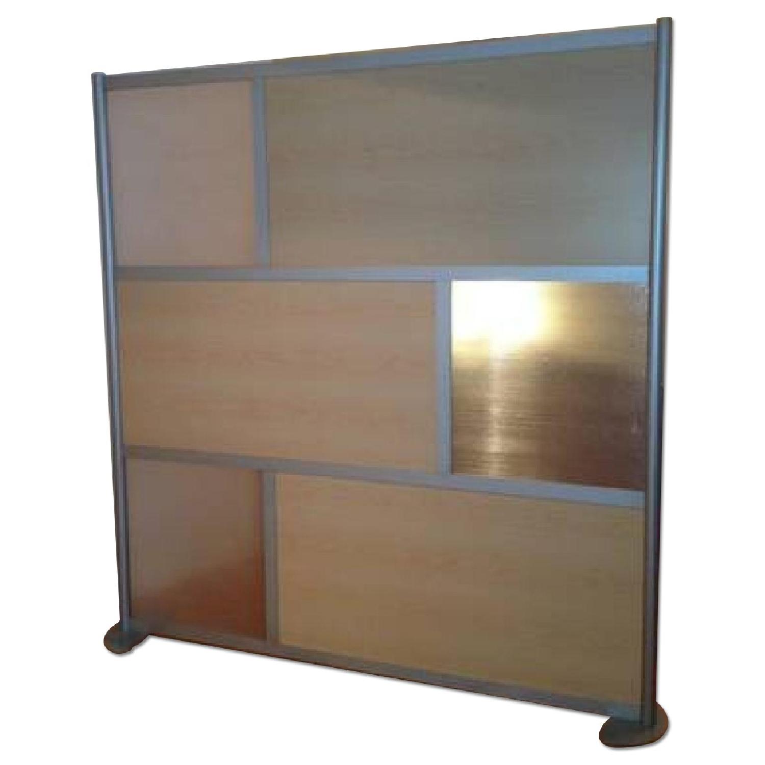 Seller's Notes:Freestanding room divider by Loft Wall for sale. Great condition. Panels can be switched around to different designs. Colors are a pine-like wood finish and opaque panels with a brushed nickel frame. Height: 78 inches Width: 74 inches Incredibly easy to assemble and disassemble. Learn more about product and see video of assembly: http://www.loftwall.com/livingspace. Retails for approximately $900.
