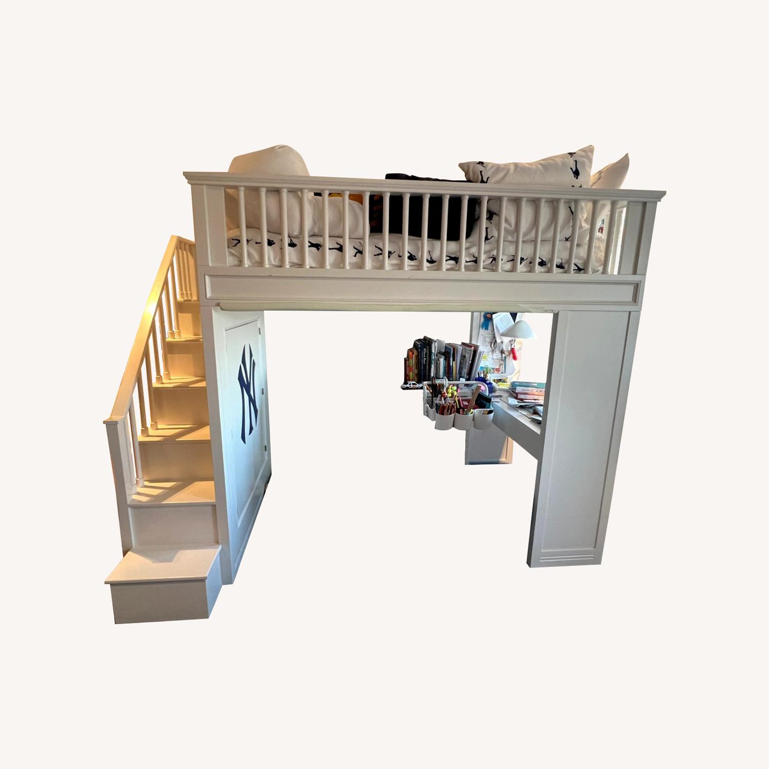 Seller's Notes:1 of 2 custom built lofted twin bed with desk, drawers and storage. It has a few scrapes from use, but is in very good condition and is a great bed.