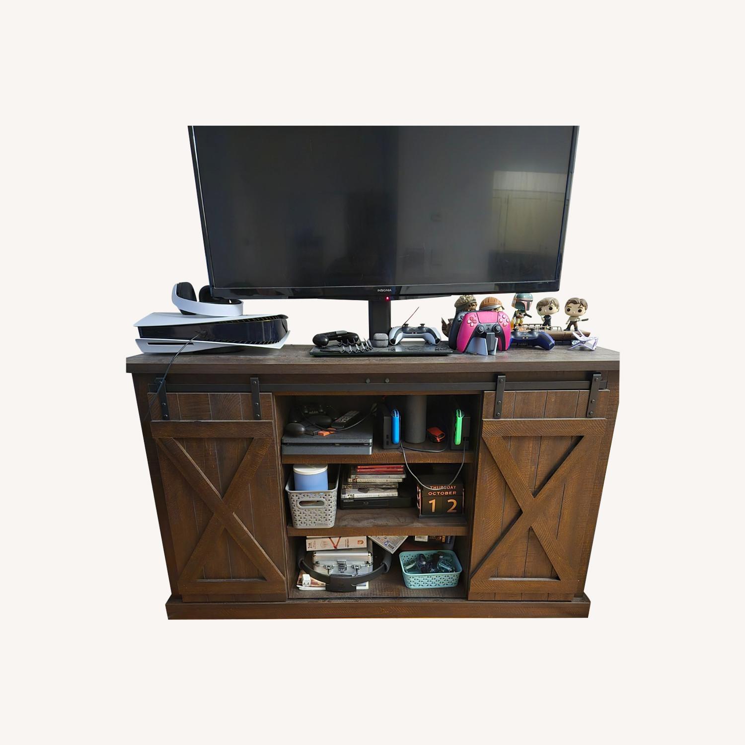 Seller's Notes:This TV stand has a charming, rustic aesthetic and provides your space with plenty of room. The frame is built from engineered wood. Each of the two cabinets opens to store media players, games, books, and other equipment, while the three open shelves give you a place to display your favorite decorative objects. We love how the barn doors add a farmhouse feel to your living room. Sliding doors and black hardware complete the country look. Plus, a cable management cutout on the back keeps your cords corralled.