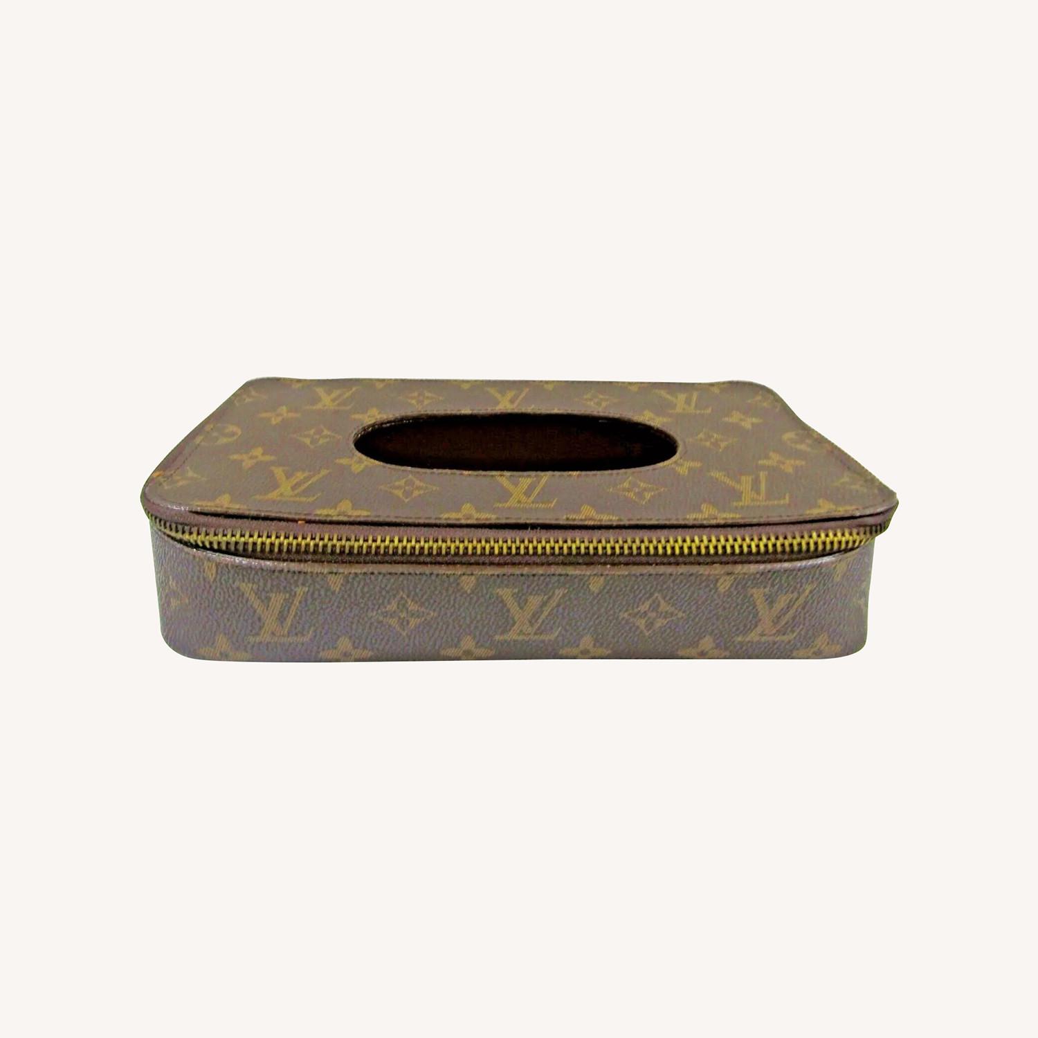 Seller's Notes:Louis Vuitton Monogram Leather Zippered Tissue Holder Box A Louis Vuitton leather tissue holder box with brass zipper pull, circa late-20th century, 1980s, '90s, France. A chic Louis Vuitton tissue box in the iconic LV leather with LV brass pull. Makers' mark 'LV' on zipper pull, also marked 'Made in France'. Marked on inside as shown in close-up image. A great piece for a bathroom, powder room, living room, bedroom, home library, vanity area, etc., many areas. Measures 10" long, 5 1/2" wide and 2 1/2" tall.