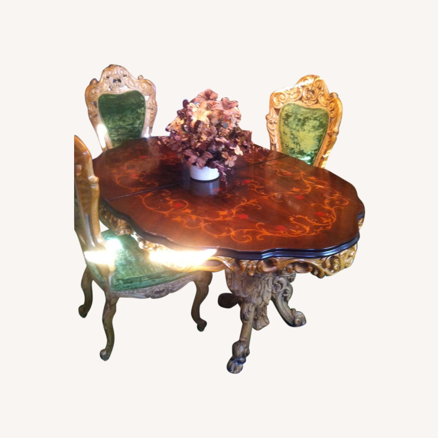 Seller's Notes:ALL SERIOUS OFFERS WILL BE CONSIDERED THANK YOU This eye catching beautiful LOUIS XVI - 7 PIECE DINING SET hand crafted & hand carved Table , 6 chairs is a must have! MADE IN THE USA It will make a profound impression on your dinner guests or clients and will receive the maximum amount of attention wherever it is placed. There is no mistaking the classic and sophisticated design of this exquisite oval burr walnut, mahogany, Oak, Maple dining room table with fabulous inlaid decoration. This table is made from burr many different Burr’s of wood, the skin of the tree, which has a beautiful grain, and also the most expensive part of any tree, and this has been embellished with the superb inlaid decoration, The table top has exquisite hand cut inlaid decorations. These regal decorations include elegant swags and ribbons. To highlight the natural grain of the wood. Burr refers to the swirling figure present in nearly all Walnut, Mahogany, Oak and Yew tree when cut and polished, and especially in the wood taken from the base of the tree where it joins the roots. However the true burr is a rare growth on the tree where hundreds of tiny branches have started to grow. The Inlaid is a decorative artistry where pieces of material (such as wood, mother of pearl, pewter, brass silver or shell) of different colours are inserted into surface wood veneer to form intricate patterns such as scrolls or flowers. The 6 hand crafted chairs are made with the same fine quality of wood & comes with high quality soft & durable velvet cushion chairs . THE PICTURES SHOW HOW BEAUTIFUL THIS FURNITURE IS . IT WAS WELL CARED FOR ***The table is worth fixing by someone with discerning taste. The table needs a loving touch to bring it back to its splendid beauty. Also comes with table extensions and a Table Cover. -Dimensions of Table 67”L 30”H 45”W -Table extension is 36”(3ft) -4 Chairs/2 Arm Chairs 27”L 48”H 20”W *** 1 Arm Chair on the arm/leg has minor imperfections