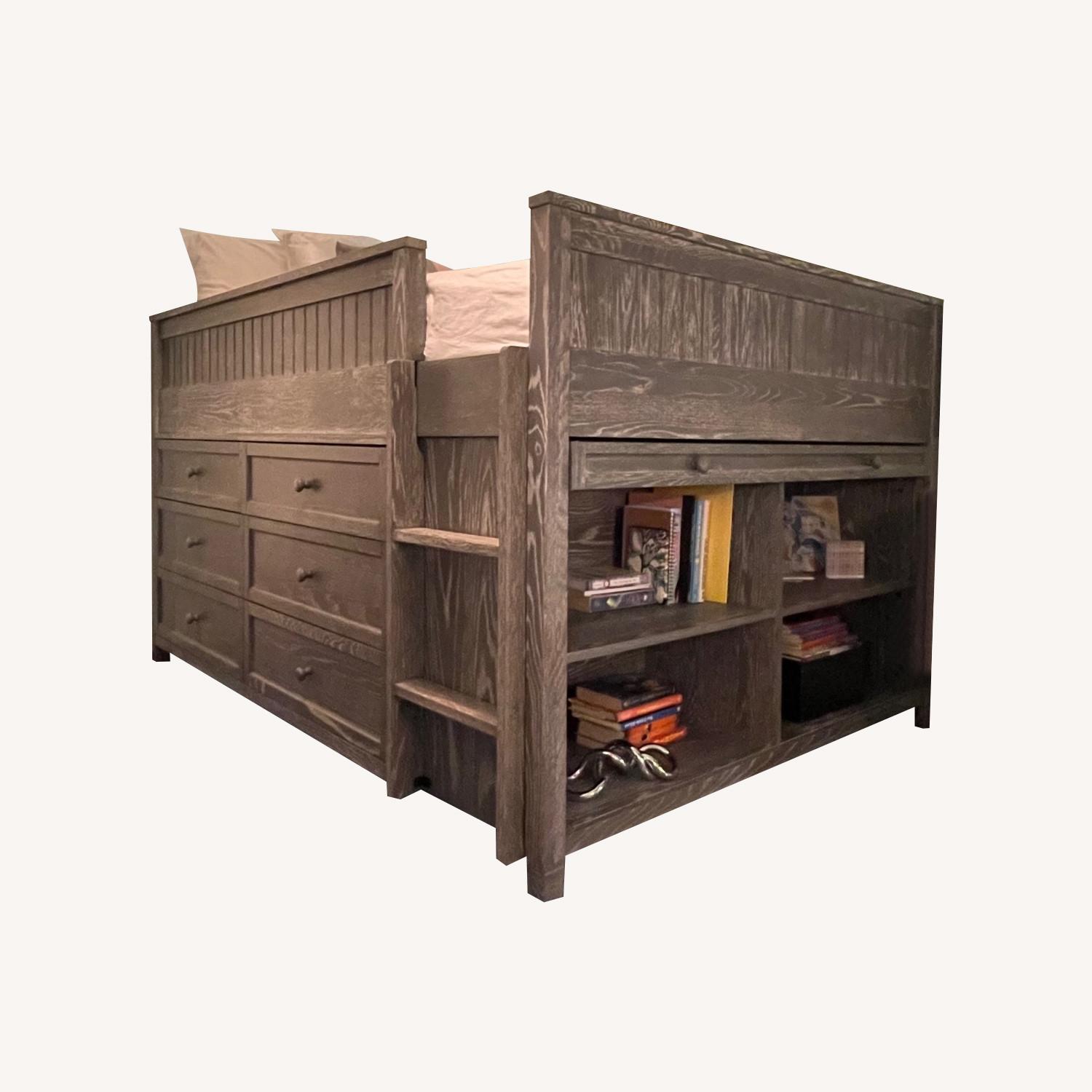 Seller's Notes:Low Loft Bed with 6 built-in DRAWERS, four open storage SHELVES and pull out writing DESK at foot of bed. Greenguard gold certified -- low VOC. Fair Trade certified. Crafted from premium wood with smart beadboard detail and smoked charcoal finish. Perfect design for city living with an abundance of efficient storage and work surface! Slat roll foundation, no box spring needed. Fits full-sized mattress. Sturdy, comfortable, safe, versatile, and fun! Mint condition.
