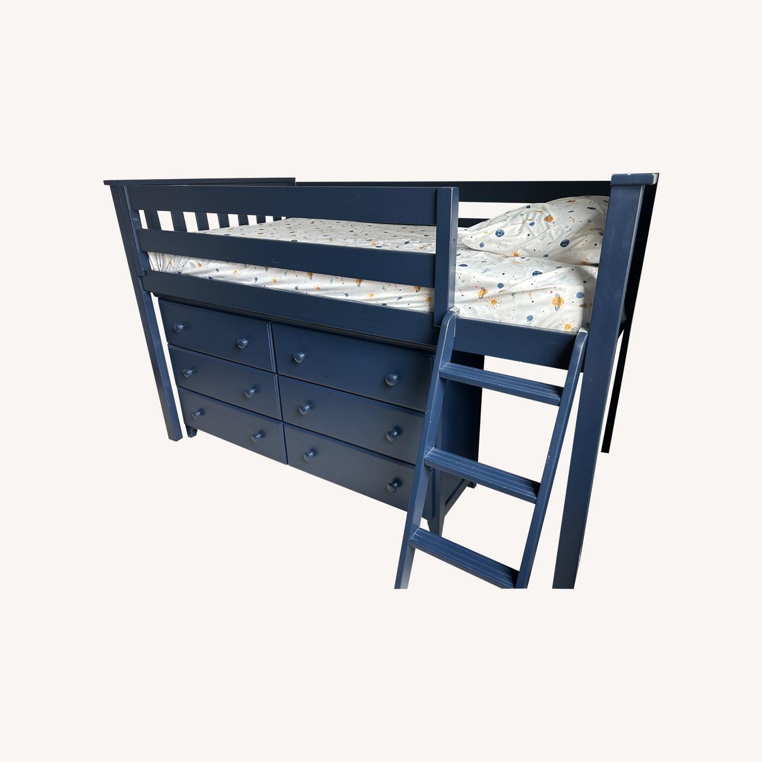 Seller's Notes:Dark blue low loft style twin bed with 6 drawer dresser and bookshelf that can both fit under the bed, if preferred. This allowed us to fit all bedroom furniture in a smaller bedroom. Bonus: there is a small hideout created under the bed as well.