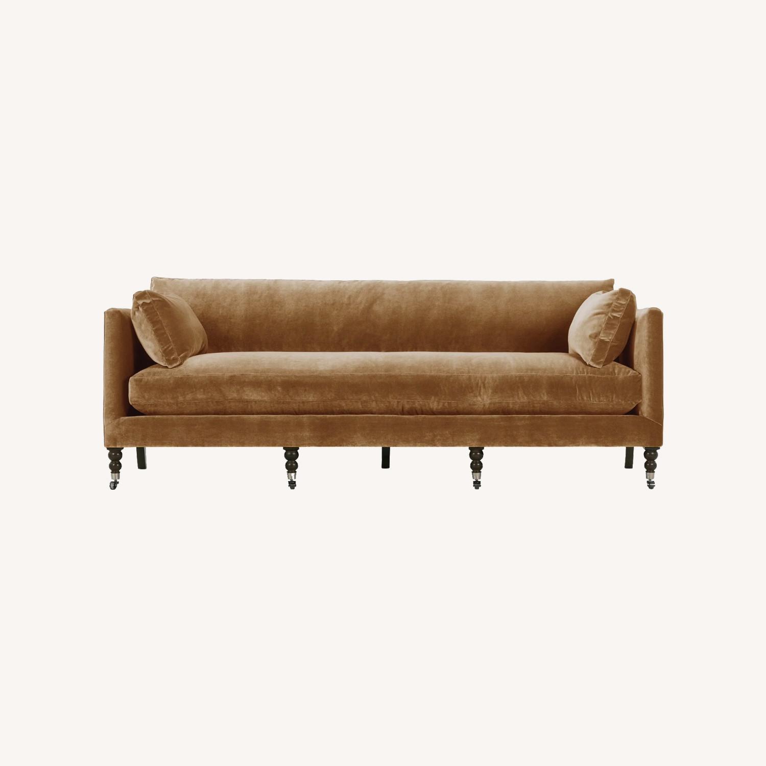 Seller's Notes:Lulu and Georgia Fabienne Sofa in Cognac Velvet, brand new under 4 months old. Antique styling pairs velvet upholstery with traditional curved legs in the back and ornate, turned legs in the front. This sofa is finished with small front wheels to ease movement. Comfortably Sits: 3 Fabric: Cognac Velvet Includes two 14" x 25" bolster pillows, 4 Legs with casters, and 3 Legs with glides Overall Dimensions: 90"W x 40"D x 34"H Seat Height: 21" Seat Depth: 24" Interior Seat Width: 68" Arm Height: 29" (from floor) Arm Width: 4" Leg Height: 7"