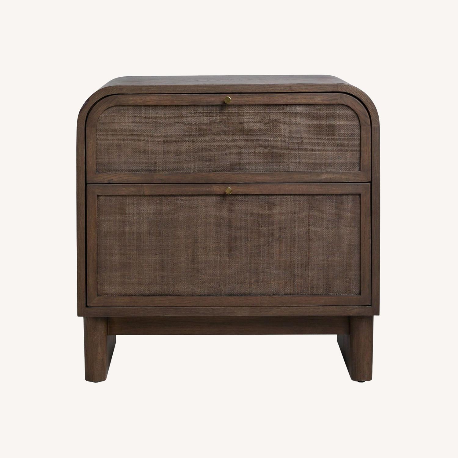 Seller's Notes:The nightstand features a rounded oak frame with grasscloth paneling. It has a smoked oak finish.. Brand: Lulu and Georgia. Material: wood. Retail price: $638. Gently used - any blemishes or damage will be included in the photos. #SKU: 1063606. Tags: oak,wood