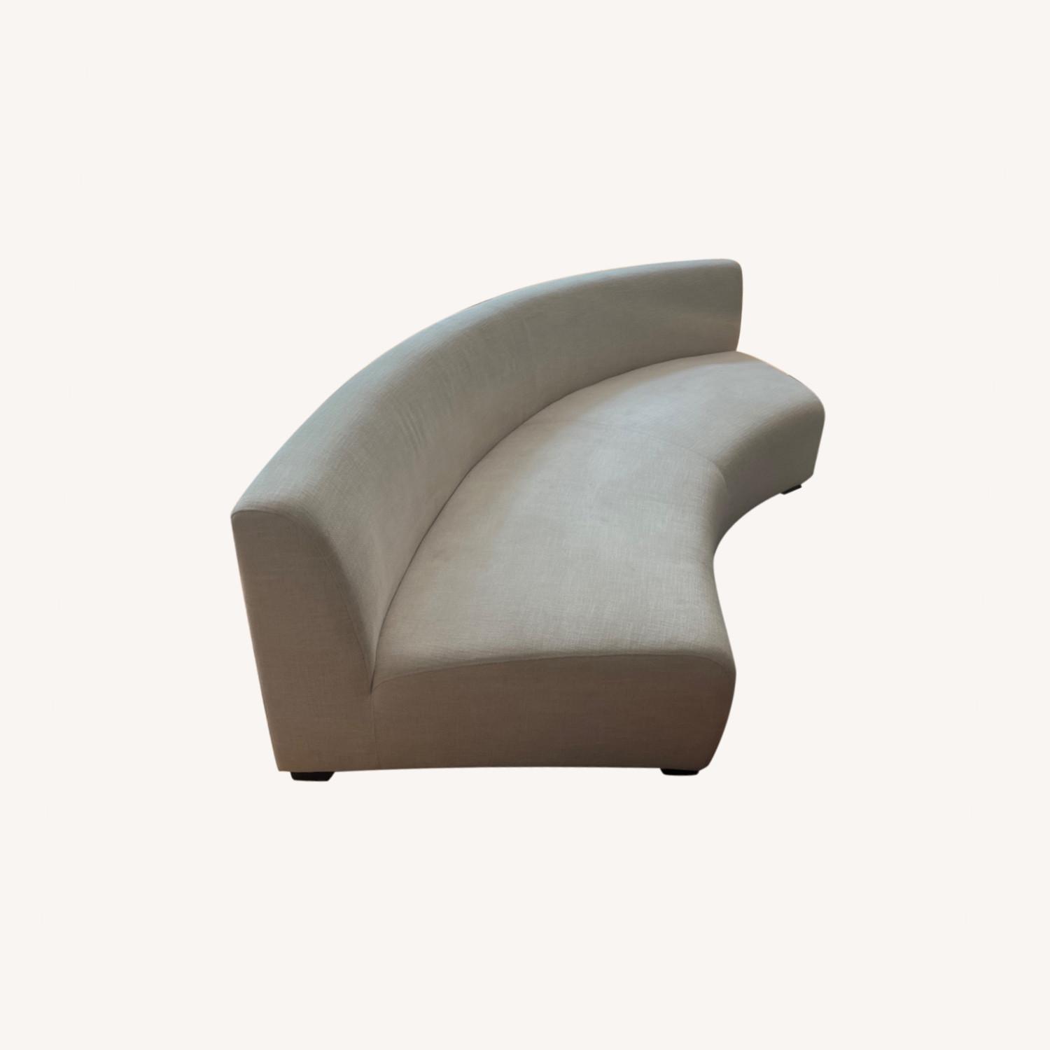 Seller's Notes:This curved sofa is anything but ordinary. A crescent silhouette makes for a grand display in any room, but you can also place them together for a full curved shape. This is the right facing piece (but the left and right pieces are identical - it’s the right piece of you are joining to the left piece). This sofa has been professionally cleaned and is under a drop sheet awaiting a new home. Minor marks were removed in the cleaning process so it looks great . It comes with two fabric cushions that match the colour of the sofa. Great statement sofa or for finishing a tricky space. Only selling as we have rented a new apartment and it won’t fit our new living space .