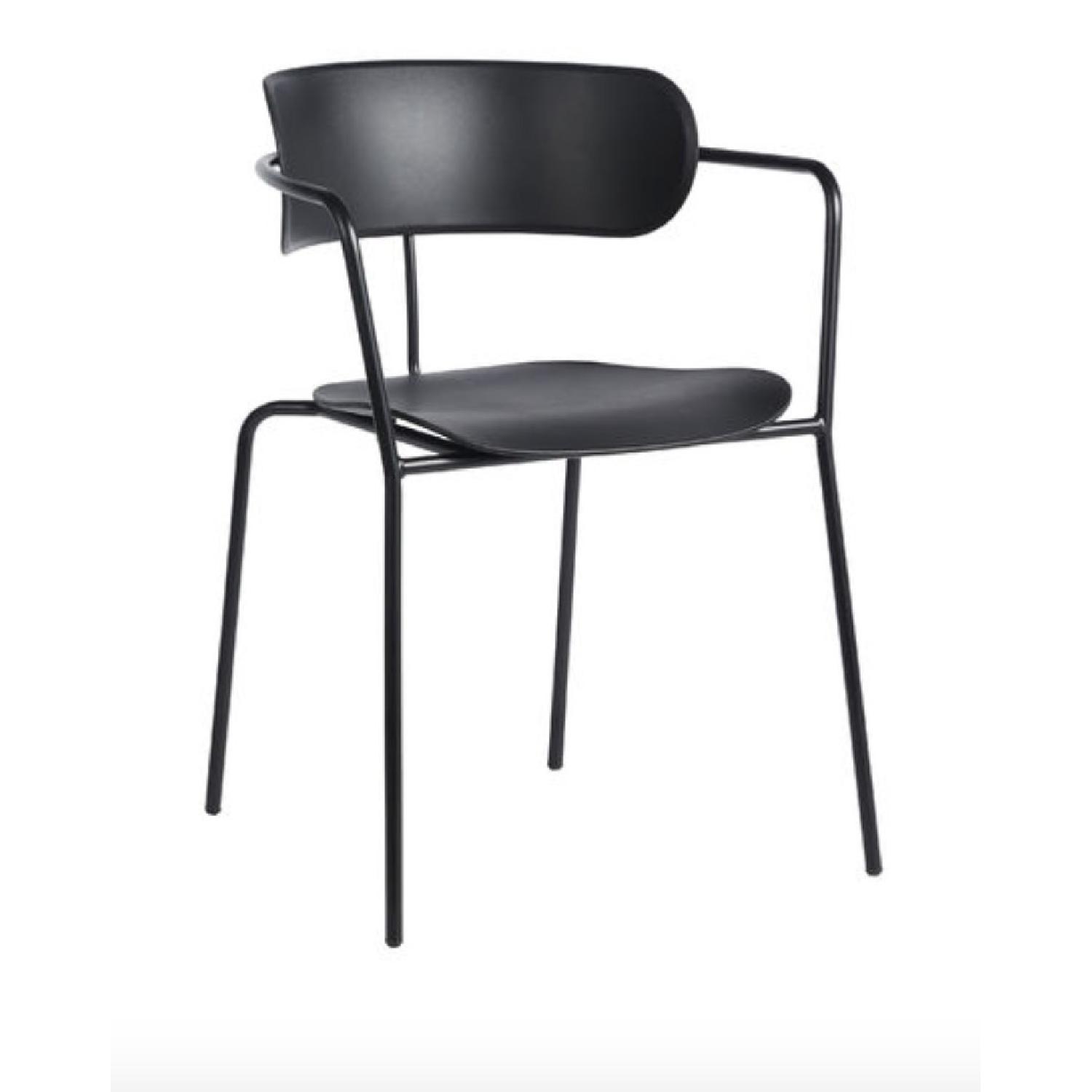 Seller's Notes:Lulu and Georgia- SAMMIE STACKING CHAIRS, BLACK (SET OF 4) *BRAND NEW, NEVER USED *Love these but doesn't fit my dining table 21.46"W x 21.07"D x 29.93"H Seat Height: 17.72" Seat Depth: 16.93" Materials: Polypropylene Seat and Back. Matte black steel armrest, frame, and legs. Seat Construction: Polypropylene Care: Cleaning Instructions: Use a damp washcloth to gently wipe the item