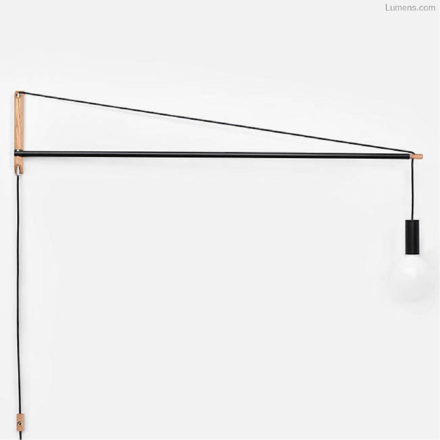 Seller's Notes: Swinging sconce pivots 180º with a cord tension cantilevered design. The light can be set to any height by simply feeding the cable through the pivoting rod. A perfect solution for modular lighting in any space. Details: - Pivots 180º with a cord tension cantilevered design - Hanging length can be adjusted by feeding the cable through the pivoting rod - Base Finish: Oak - Material: Steel, Oak and cord - Switch Included - Installation Type: Plug In - Made In USA - Arm Length: 4 Feet Lighting: One 60 Watt (570 Lumens) 120 Volt E26 Medium Base Incandescent Lamp(s) (Included)