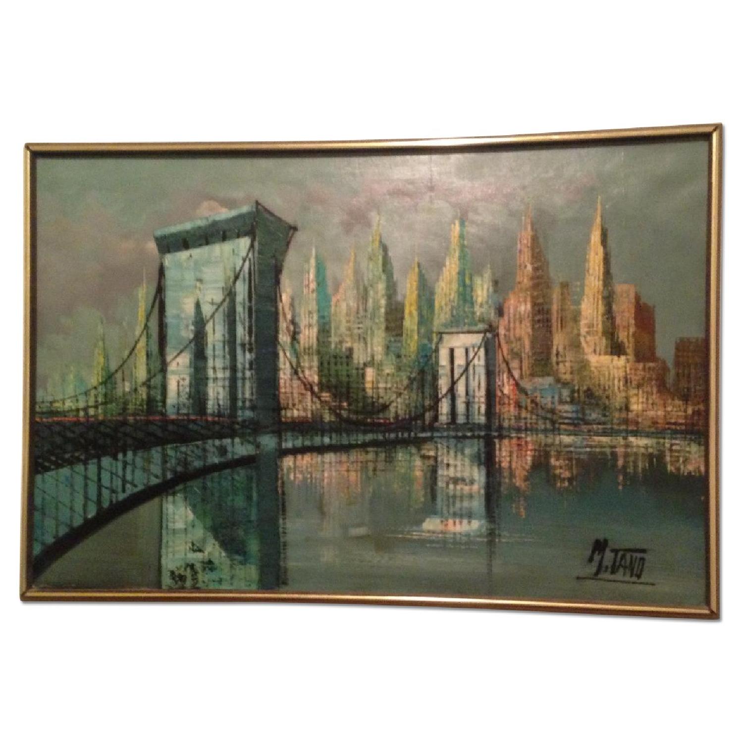Seller's Notes:Painting of the Brooklyn Bridge signed M. Tano in a wood frame with golden detail. 1956.