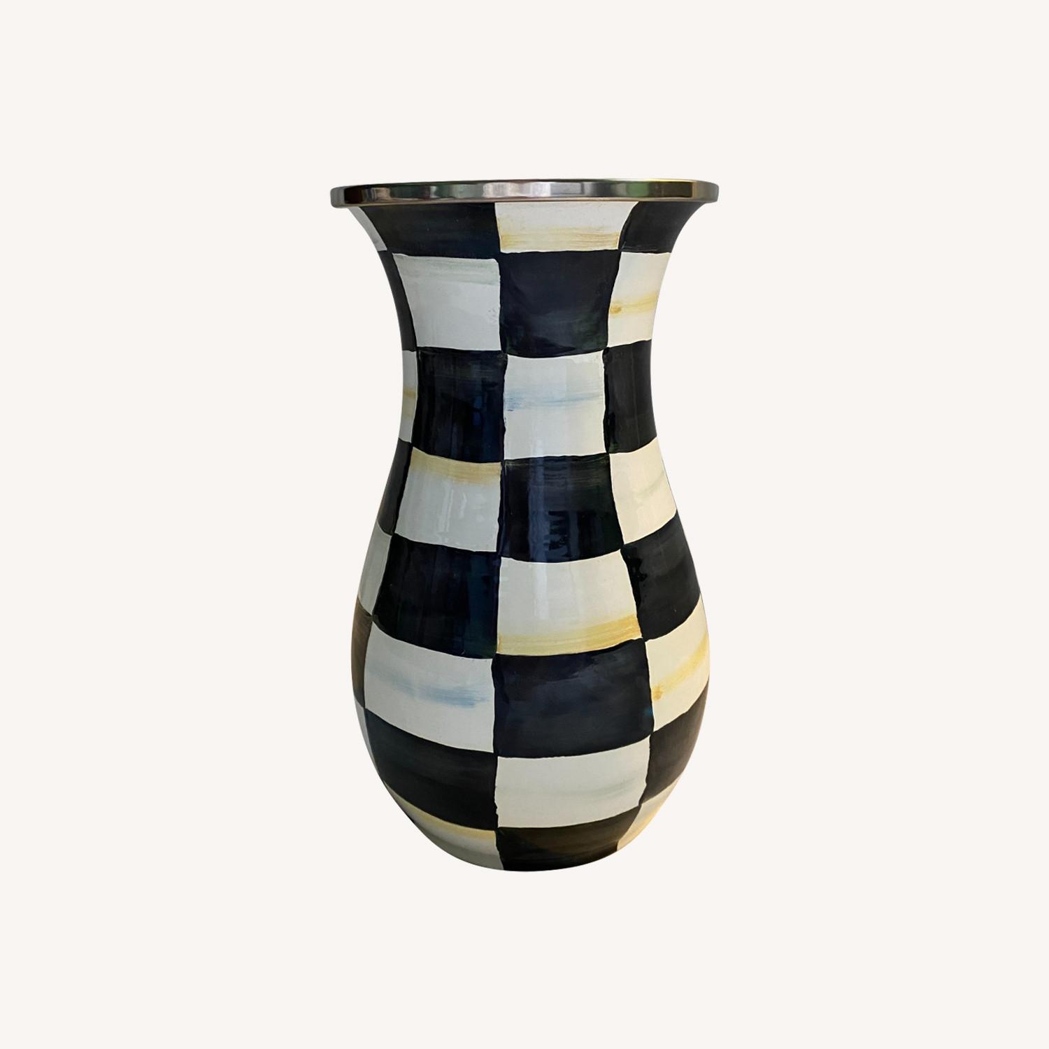 Seller's Notes:Inspired by traditional glass milk jugs, Mackenzie-Childs’ classic Tall Courtly Check Enamel Vase is made of hand decorated enameled steel, with a bronzed rim. A classic, eye-catching design in black and white with splashes of yellow and blue. About 10.5 inches tall. Not boxed but like new.