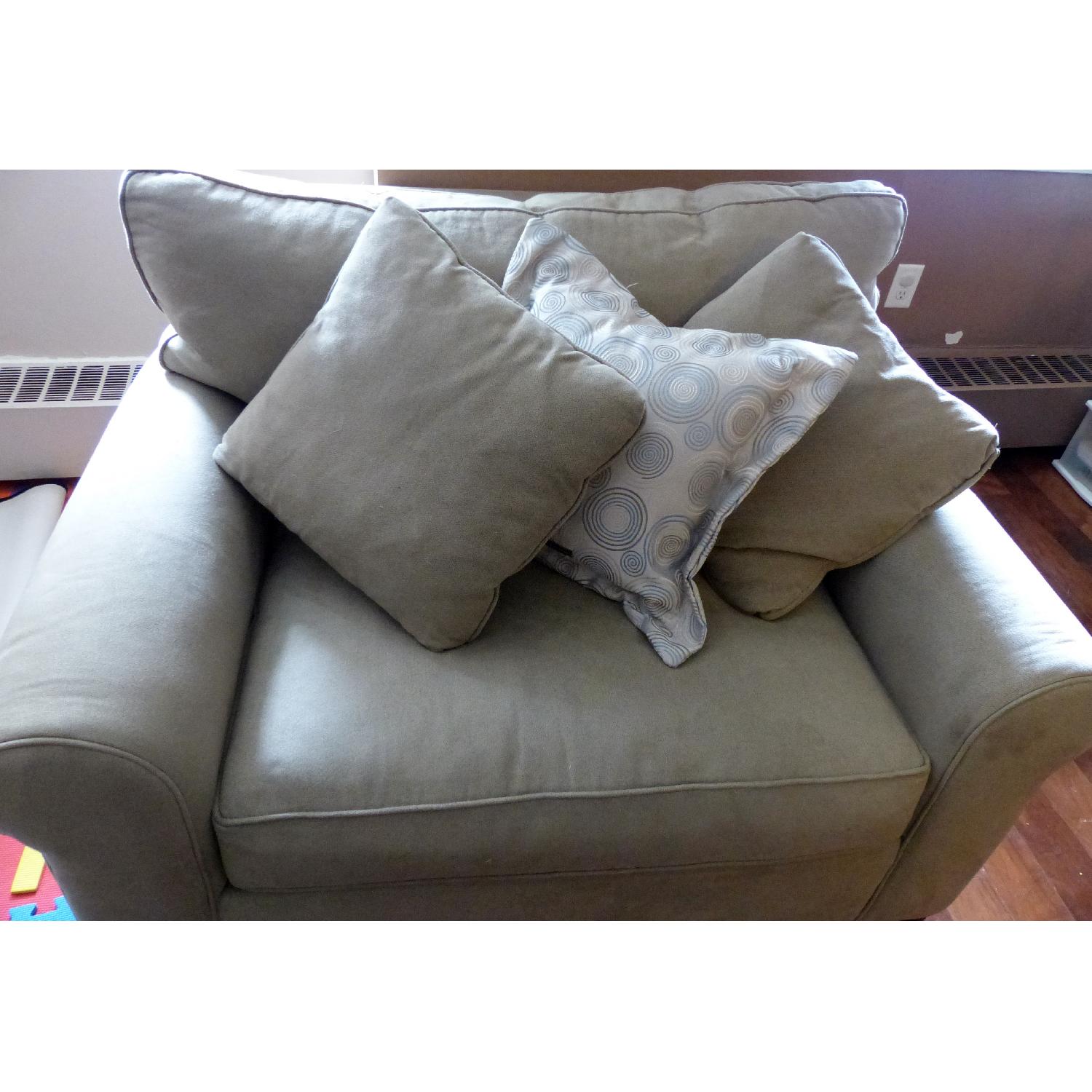 Seller's Notes:Super comfortable "chair and a half"is in between the size of a chair and love seat and fits one to two people comfortably. This item is a sage color fabric and is sold with 2 pillows that it came with and an additional decorative pillow.