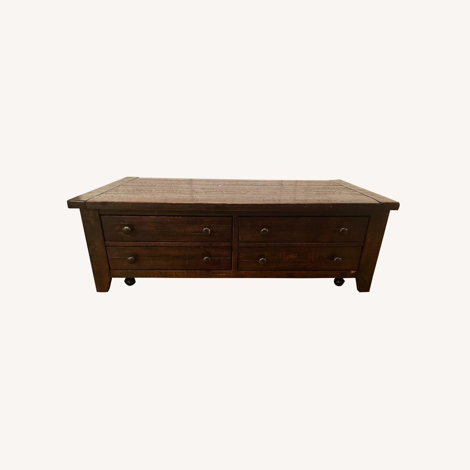 Seller's Notes:Naturally roughhewn planking and a heavily glazed matte finish give this coffee table a rustic feel in a bold way. Its four drawers add storage and versatility while fitted casters allow it to be easily moved around your living space.
