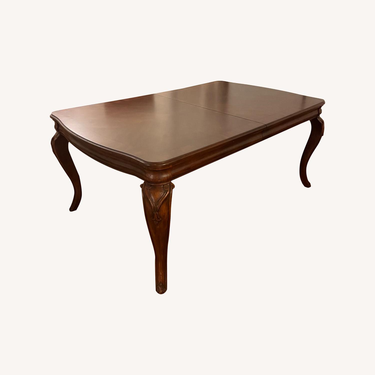 Seller's Notes:Traditional Louis Phillipe style Evolution Leg Table. The table extends from 44"x72" to 44"x84" and 44"x96" with two included 12" inch leaves and seats up to 8 comfortably. All pieces have been maintained in pristine condition with only tiny scratches on side that are barley noticeable. I have kept table covered with a table pad and tablecloths all these years and will include these protective pads and the leaves in the provided protective case. Warm natural wood grains and Oak mahogany veneers are used to highlight the timeless design. The intricate design detail is only achieved using solid wood. Color: Rich Auburn. Material: American Hardwood Frame, Quartered Figured, Mahogany Veneers per website provide description.