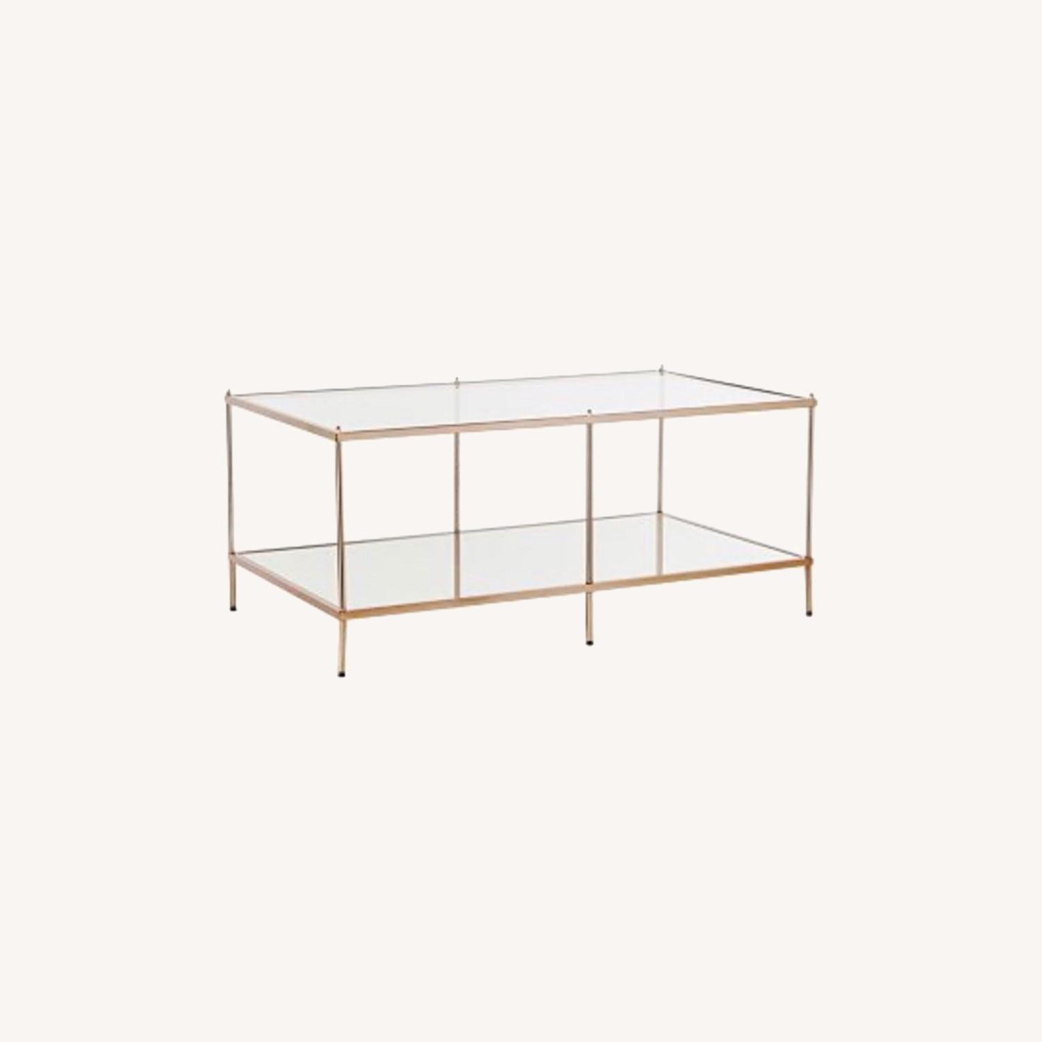 Seller's Notes:Hollywood sophistication swings to life in this elegant cocktail or coffee table. Shimmering mirrored shelf shows off tchotchkes, conversation starters, or board games, while sleek glass tabletop displays flower arrangements and coffee table books. Reflect glamorous style with this blushing gold cocktail or coffee table in a living room, formal parlor, or entryway.