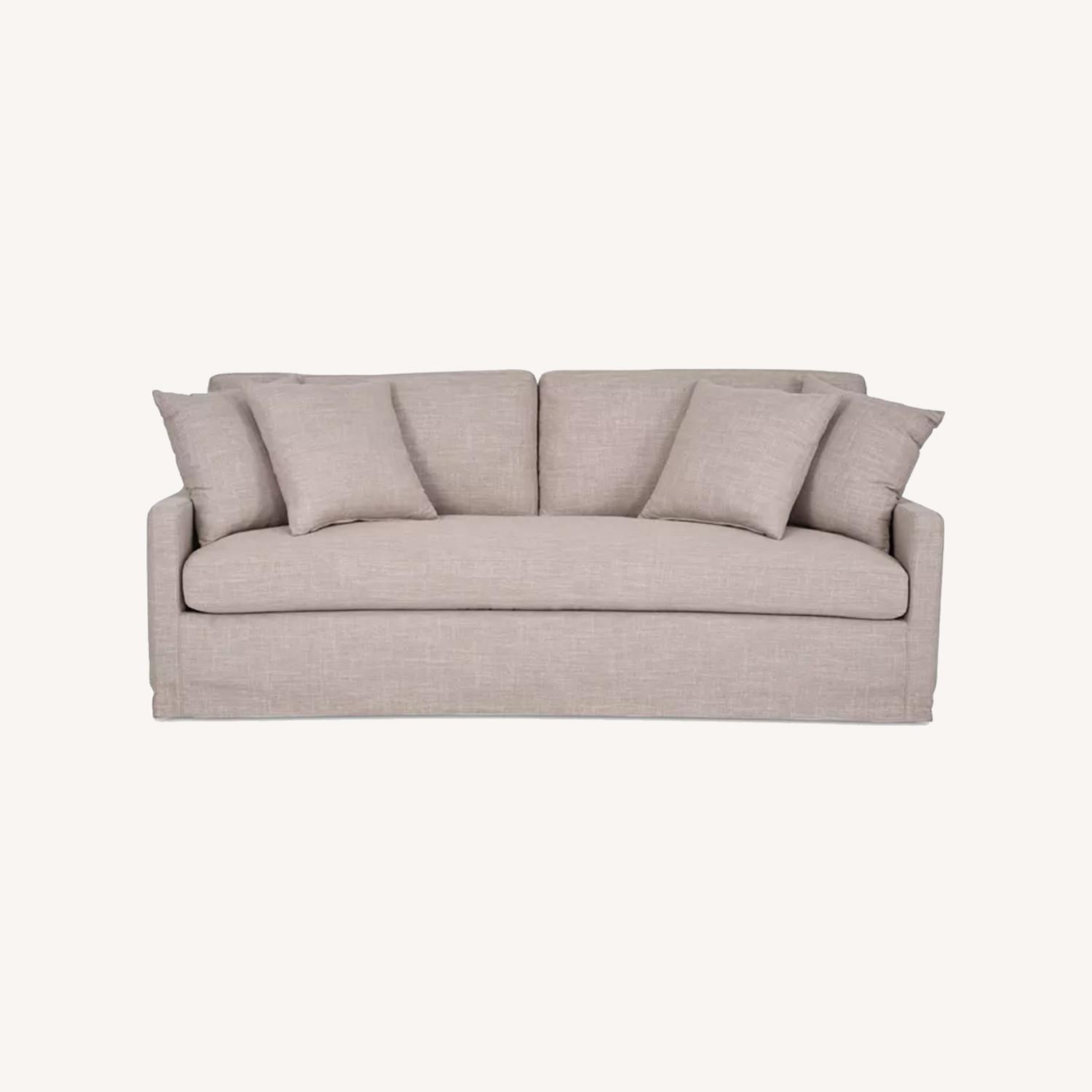 This stunning sofa features a subtle curved front and back design, providing an elegant and sculptural element to any room. Even better, this sofa is made with highest-quality 8-way hand-tied seating construction and a multi-density foam core seat cushion supported by tie-downs on either side. The slipcover is removable for easy cleaning and maintenance, or for seasons when you're looking for a change. Additional slipcover options in on-trend fabrics and colors are available for sale. Combining the relaxed elegance of a slipcover with a design-forward shape, this collection is a must-have.