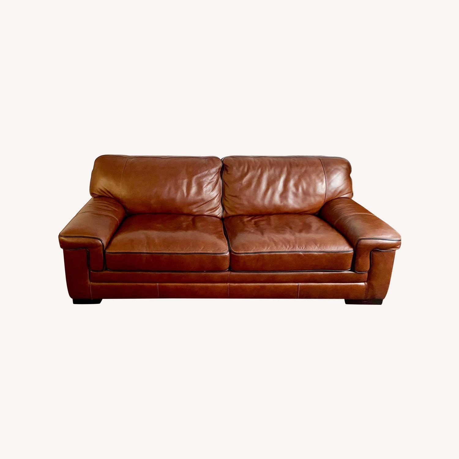 Seller's Notes:Hi All- My couch is in very good condition, with some minor wear and tear that primarily relates to moving apartments. In addition to the pictures that I took personally, I've also included stock photos as well. I've included further detail below, including a general description, dimensions, and materials overview. Thank you! Product Overview: Crisp geometric lines combine with plush cushions to deliver this handsome sofa. Enveloped in buttery smooth leather with contrast piping and stitching. • 100% Leather • 2.2 lb. foam cushion with washed feather/fiber topper and Dacron wrap • Sofa is supported by European style webbing suspension rather than a spring system Product Dimensions: • Total Approx. Dimensions: 91''W x 41''D x 37''H • Seat dimensions: 22" • Arm height: 23" • Seat height from the floor: 20" • Seat length between arms: 65 Materials & Care: • Plywood and solids frame; Wood feet with antique espresso finish; 100% leather; Foam • Clean with a damp cotton cloth • Imported