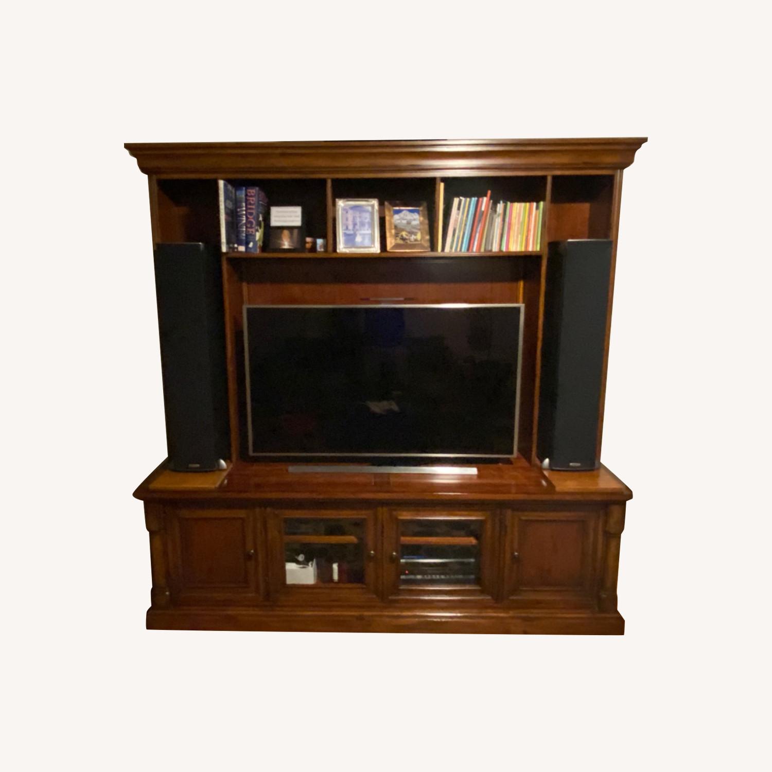 Seller's Notes:Solid wood, heirloom quality media storage unit from Macy's. This is a really nice piece with minor wear and tear from a smoke free, pet free home in Park Slope. Tons of storage in the cabinets underneath and the freestanding hutch above. 8 shelves (included) can replace speakers on either side of TV. Fits up to 55" TV. Plenty of openings in back for wires/cables. A very nice unit.