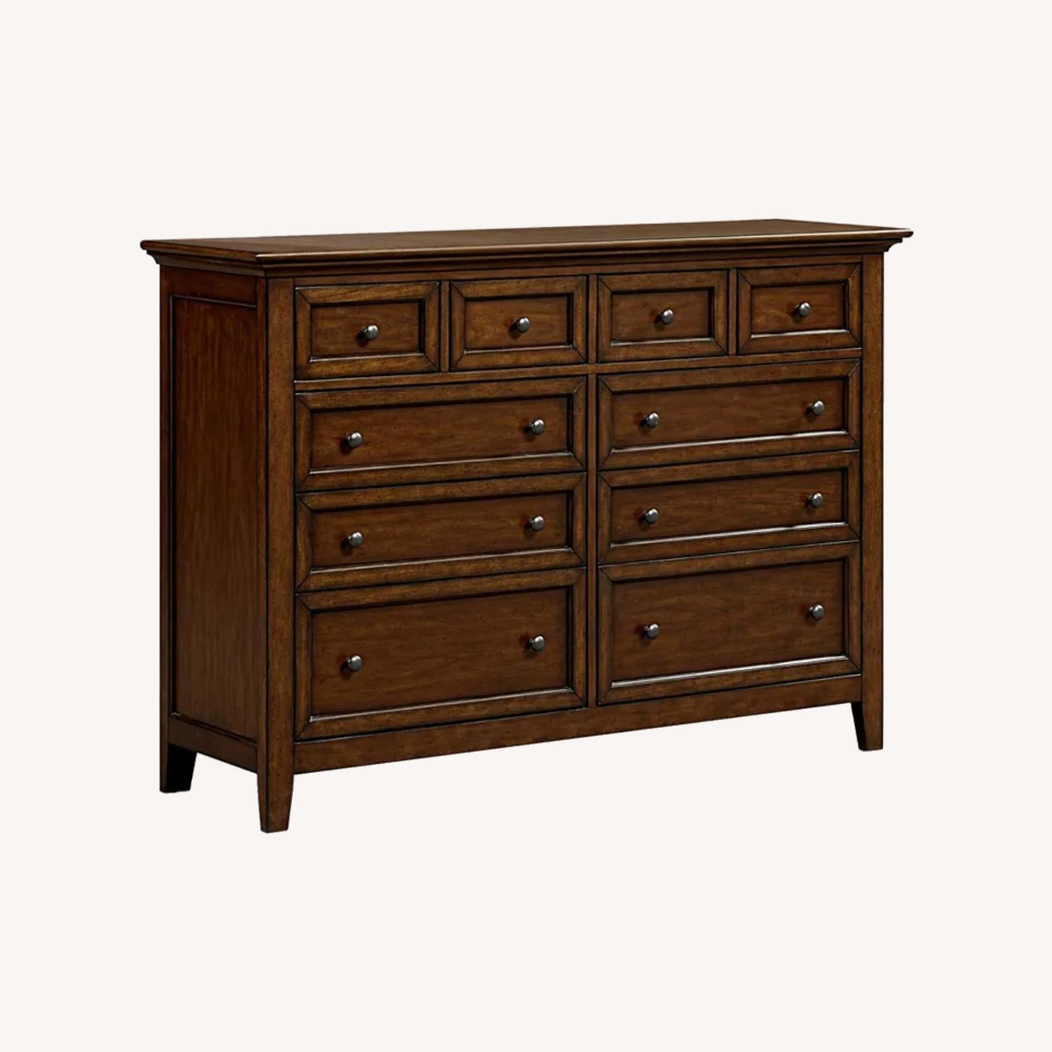 Seller's Notes:Minor scratch on the left side. Fortunately, it is hardly noticeable. Drawers are very clean. They all pull out smoothly without any issue. I bought it at Macy's four years ago. The collection is now discontinued. It fits all my clothes! However, I have to move. A new classic. Framed paneling, tapered legs & stepped molding give this dresser a distinctive style. Cherry veneers add layers of warmth to your room & are artfully complemented by the aged iron-finished hardware.Tapered legs Individually framed drawers, framed end panels & aged iron-finished hardware Multiple steps under top molding Finished dust-proofed drawer interiors with English dovetail on back & French dovetail on front 10 drawers