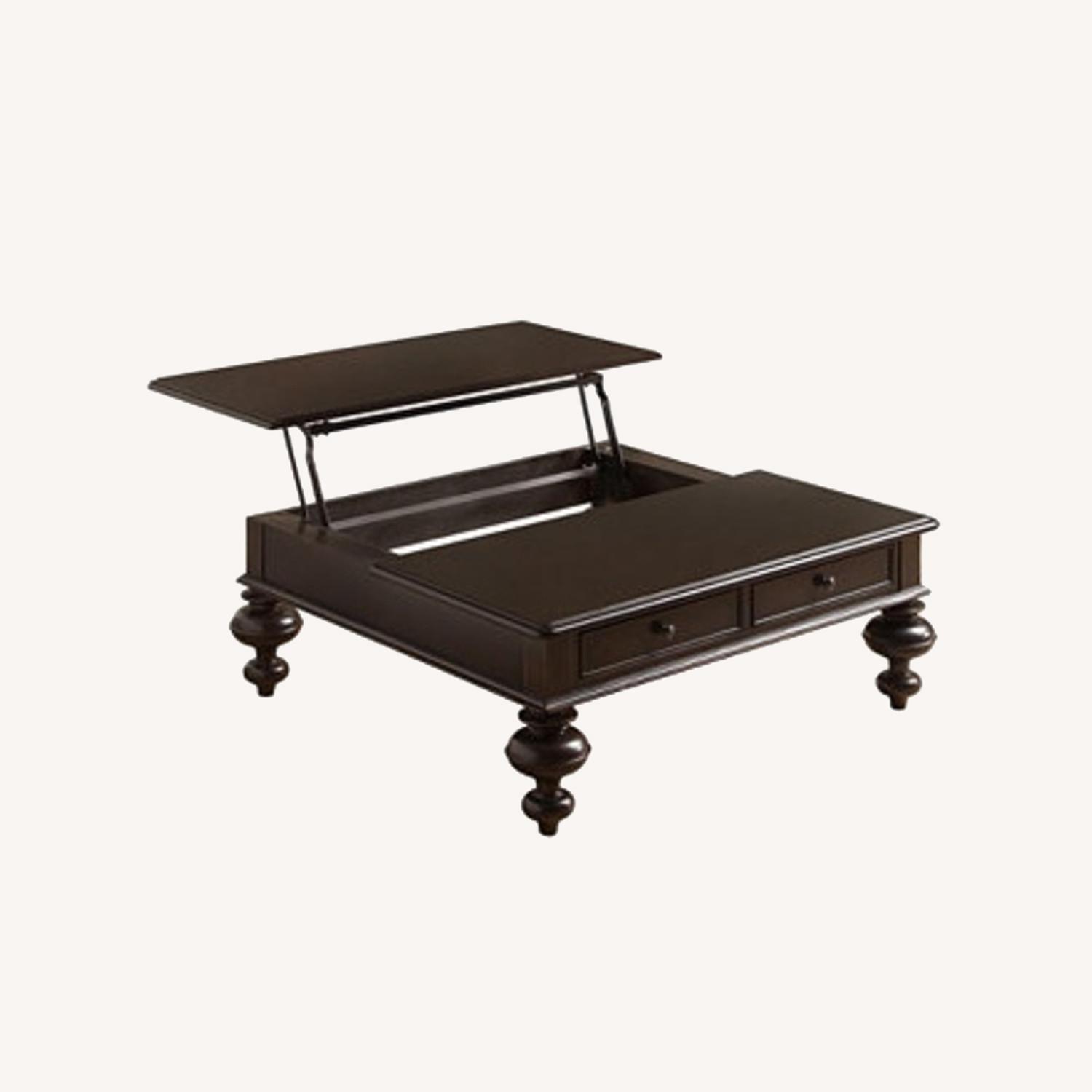 Seller's Notes:Beautiful dark wood lift up oversized coffee table- including 2 large storage drawers