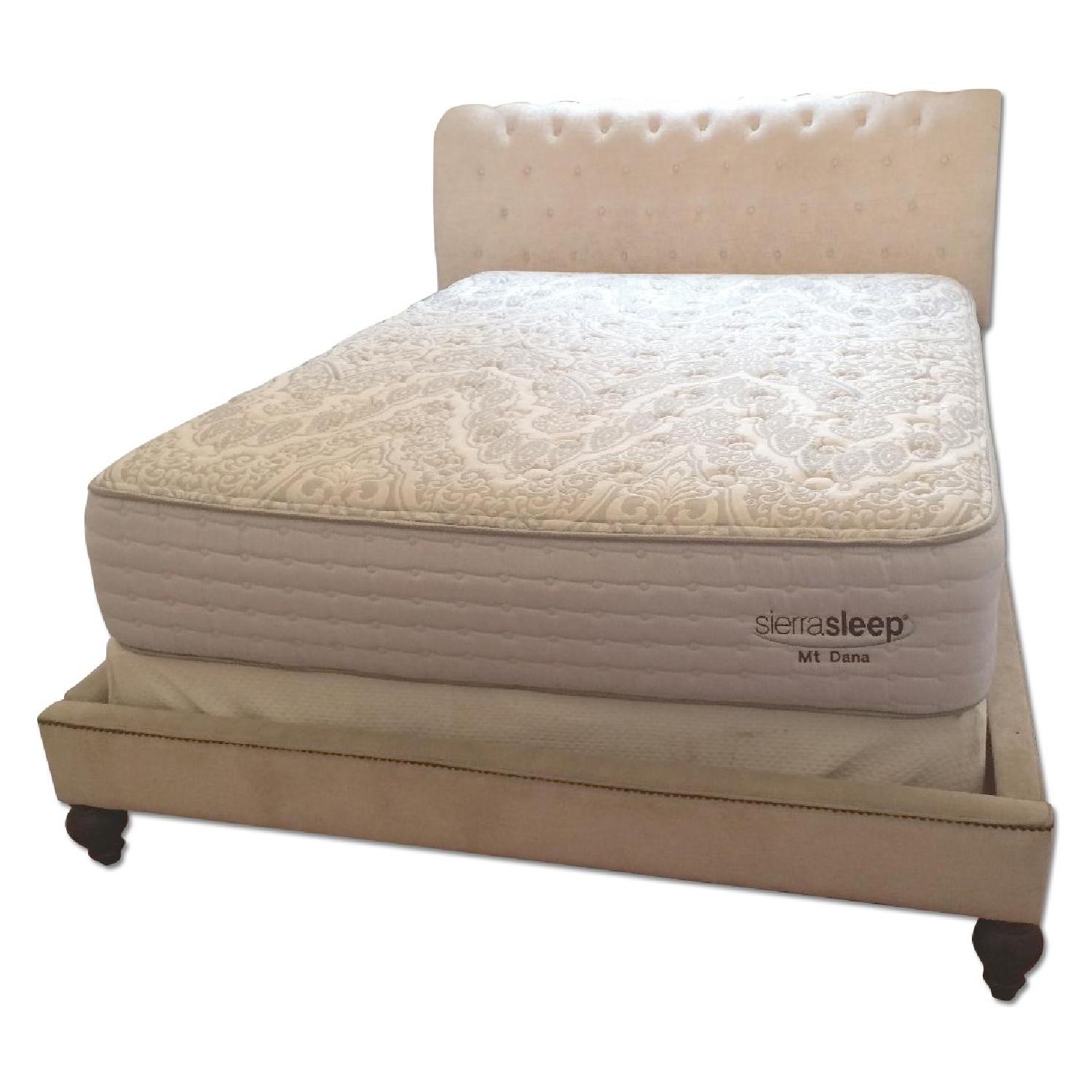 Seller's Notes:Upholstered Tufted Sleigh Bed with Nailheads- Too Large for New Apartment. I moved into a new apartment in Harlem and I am selling my super comfortable Macy's Tufted Upholstered Bed. This is a Queen Bed. I love it, but it is not fitting my new space. I need a smaller bed in the space. It has a modern, yet traditional look that is similar to Restoration Hardware. The bed is 3 years old and is in good condition. It is the perfect bed for those who love a glamorous look. The Bed has minor scorch marks in the back, where the bed touched the radiator. Not noticeable. The images do not do the bed justice! Fully Padded Sleigh Bed Design. Neutral Beige fabric with nice texture and a soft feel. Button Tufting. Turned Legs. Antique Nailhead Accents Throughout. Comes with Manufacture's Cleaning Kit. Bed measures 67.5"W x 99"D x 50"H Bed Retails for $1299.00 Made in the USA. Comes from Clean, Pet-Free, Smoke-Free Home.