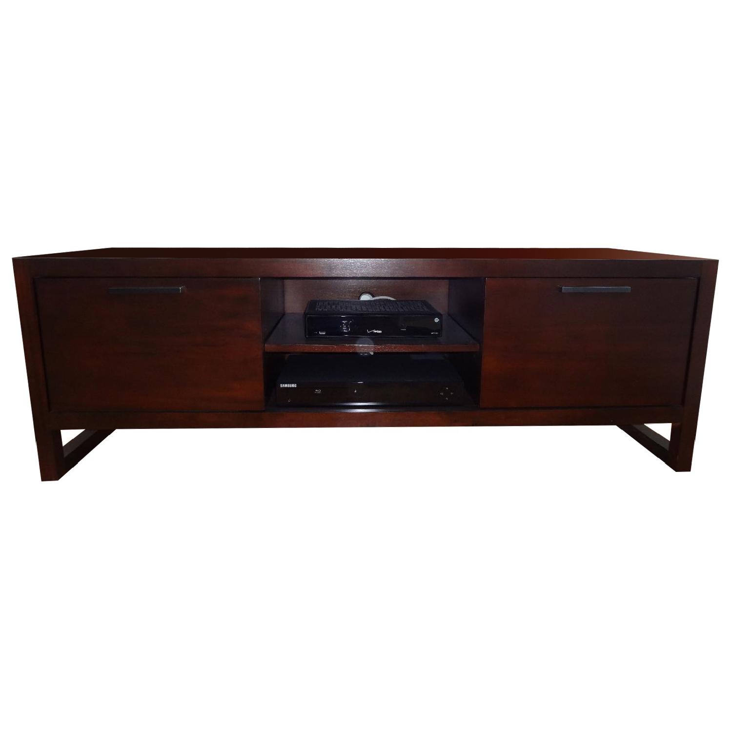 Seller's Notes:Solid wood TV console purchased from Macy's in 2013. Color is dark brown, only has very minor wear and tear. Comes from one person household; no smoking and no pets. Middle shelf (exposed) can store electronics such as DVD players or cable boxes. Left hand side has drawers that can hold CDs/DVDs, right hand side has two enclosed shelves. Selling due to overseas move.