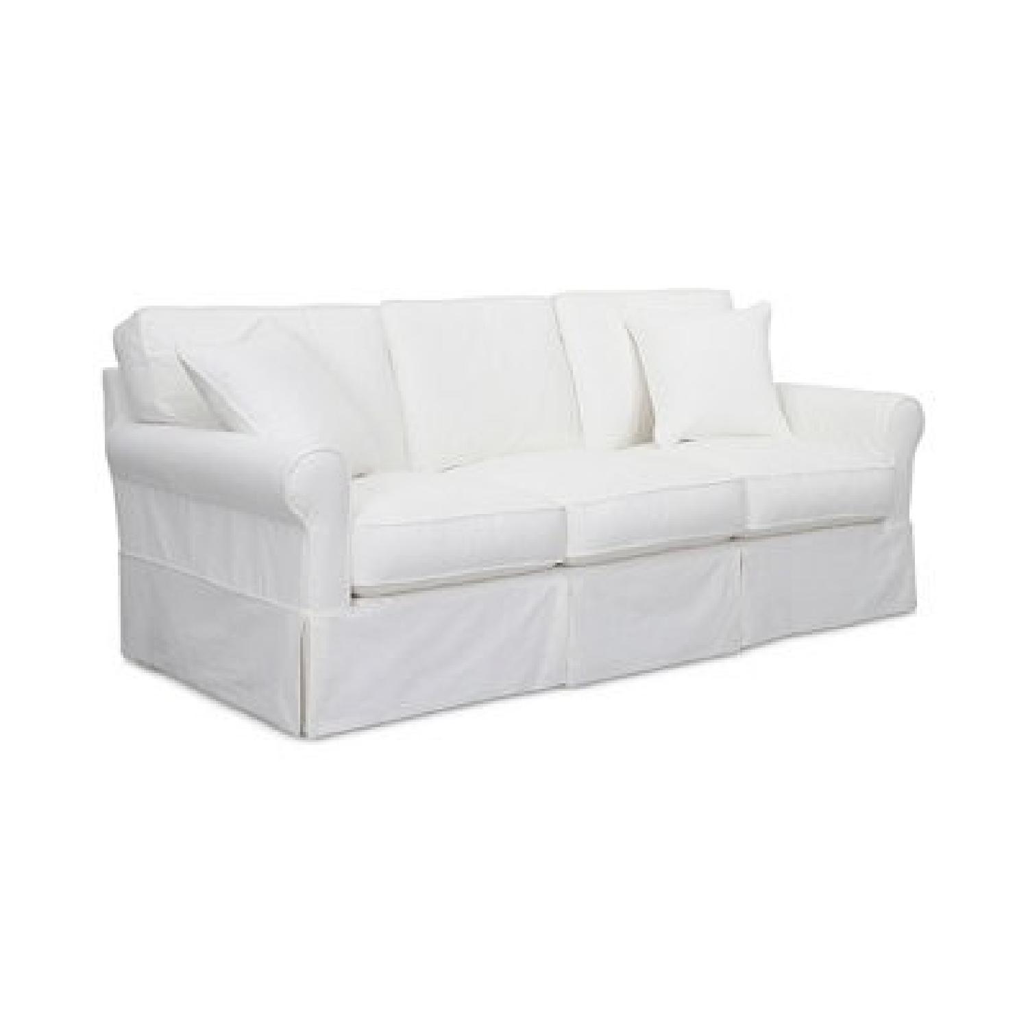 Seller's Notes:Dimensions: 86"W x 39"D x 36"H I love this couch and am sad to give it up! So comfortable and beachy. The couch is three years old and there is some yellowing and light stains that should come out with cleaning. It is a white couch after all! With a minimalist style & classic design, this sofa offers the ultimate in comfort & sophistication for any room in the house. * Dimensions: 86"W x 39"D x 36"H * 1.8-density foam with polyester blend * Padded outside arms & back * Kiln-dried frame prevents warping & cracking * Removable slipcovers are dry-clean only * All dimensions listed are approximate * 100% cotton; hardwood spring rails & furniture-grade plywood