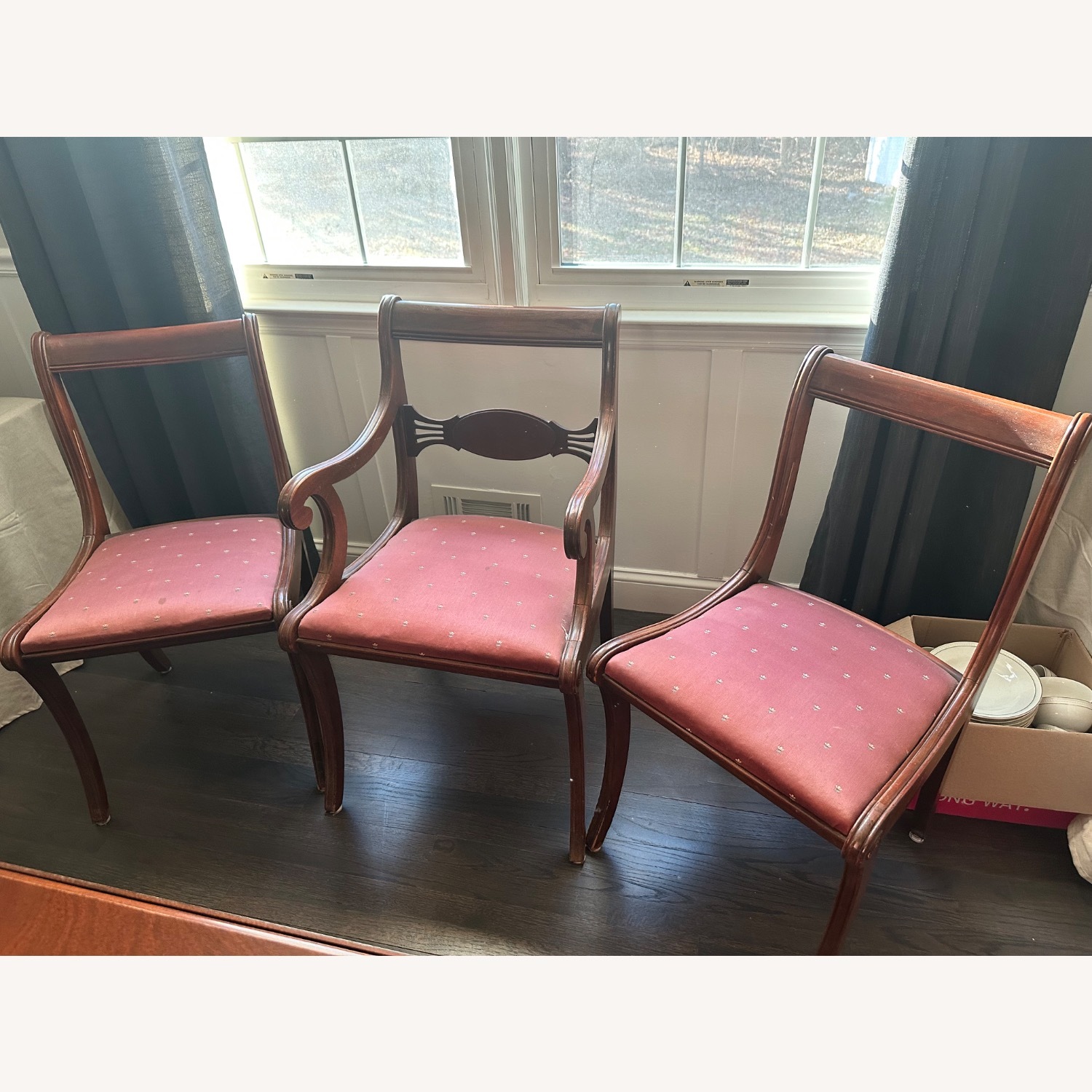 Seller's Notes:This is a set of 6 mid-century Duncan Phyfe style mahogany dining room chairs made by Maddox Colonial Reproductions. There are 5 regular chairs and one arm chair. All have matching pink/flowered upholstered seats. I’m not sure if the seat fabric is original. Please note that two of the chairs are missing the wooden fan piece on the back. And some of the legs have some scratches.
