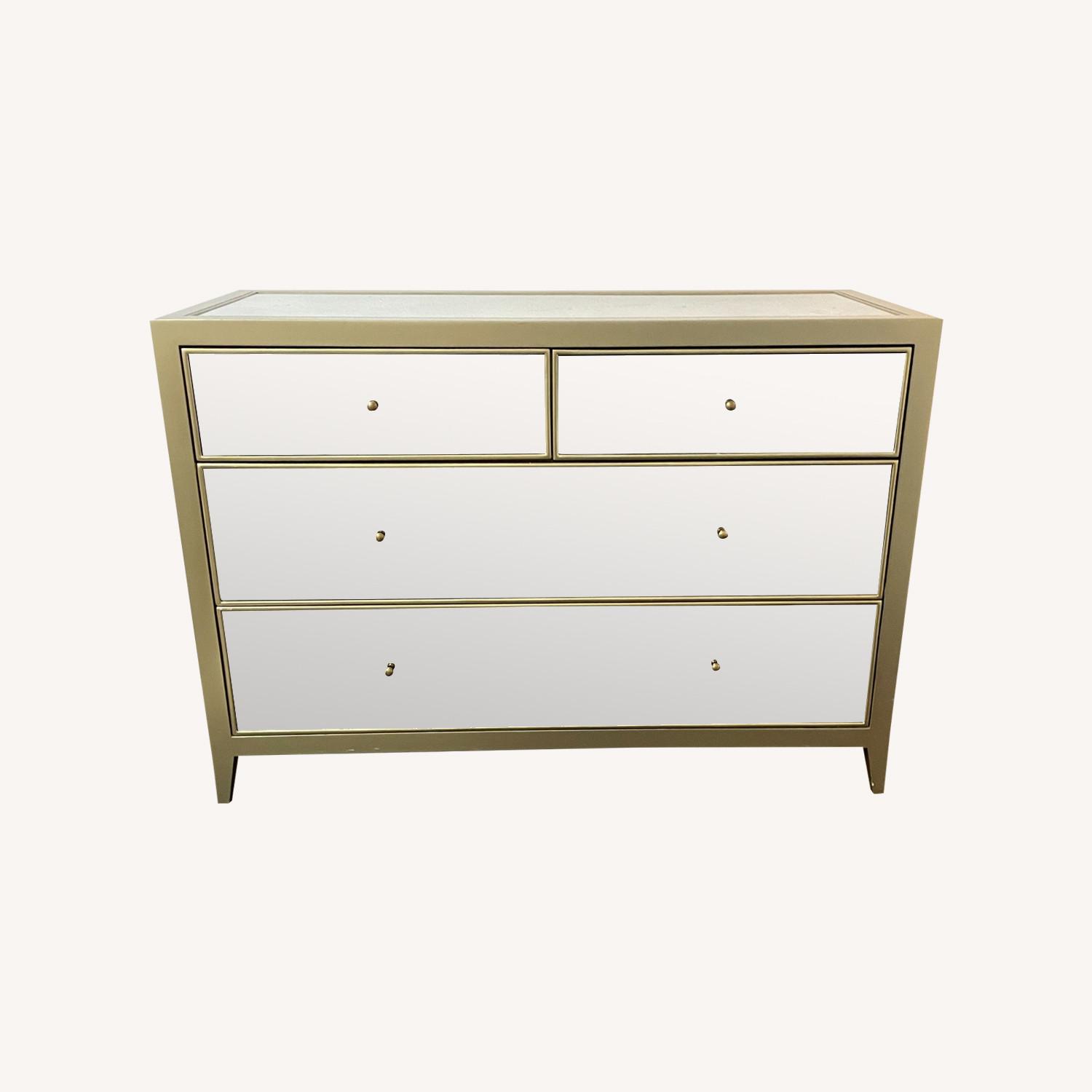 Seller's Notes:The Mia collection highlights the beauty of mixing materials, a hallmark of Made Goods’ design. Delicately hand-antiqued mirror is the focus material, creating a warm, interesting base to build upon. This mirror is fully trimmed in wood or faux shagreen. Wood finishes come in cerused oak (whitewash or brownwash) or Palladian Silver Oak, which gives off a soft glow like that of unpolished sterling silver. Our newest trim option is luxurious faux shagreen. With all variations, the integration and interplay of textures and materials elevates the Mia Collection to be a true standout. We bought this dresser for our first apartment and have loved it dearly. It has deep drawers and is a beautiful addition to any room.