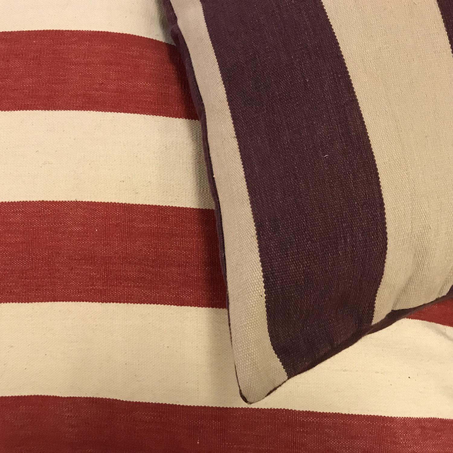 Seller's Notes:We are selling two rare Madeline Weinrib pillows. These pillows are very large - 3' x 3', they are cotton with down fill. They're great to use as extra seating (as floor pillows) or can be used decoratively around the house. We've even slept on the two of them together and it was shockingly comfortable! The first pillow is Red and Natural White. It shows no signs of wear whatsoever. The second pillow is Aubergine (purple) and Tan - this one has a tear along a seam that someone could easily fix. Other than that, no signs of wear. We purchased these at a sample sale at ABC Carpet and Home about a year ago for $350 each (we still have the tags). We are now selling for only $75 each. We loved these pillows when we got them - bold, gorgeous quality, etc. But, after much trying to make it work in our apartment, we just couldn't find the right space for them.