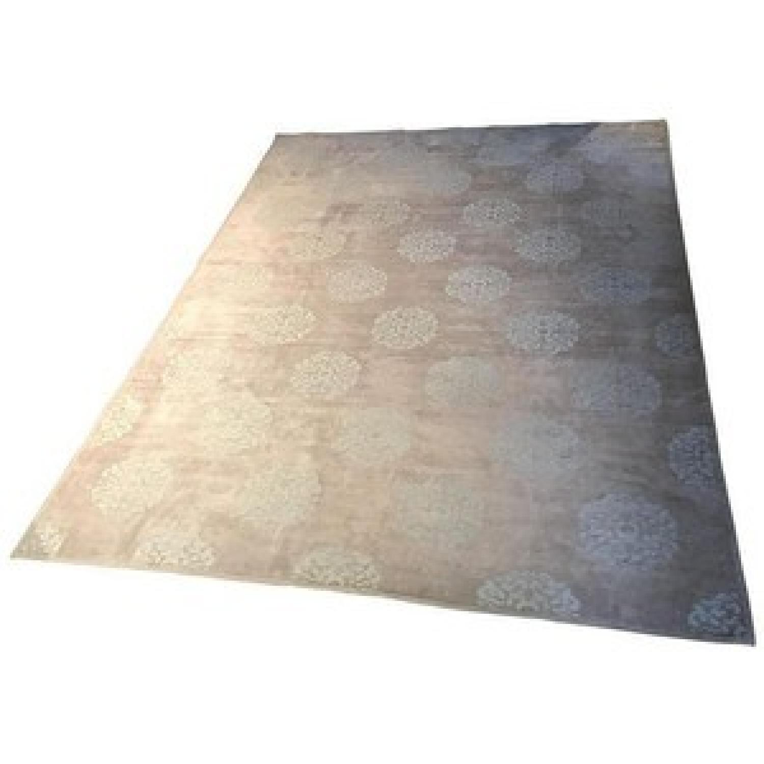 Seller's Notes:Beautiful pale lilac Mandala chenille and metallic carpet. Hand-woven in India, the luminosity of the metallic fibers adds an extra depth to the designs. Cotton chenille ground, silver metallic motif. Reversible. There are a few barely visible stains.