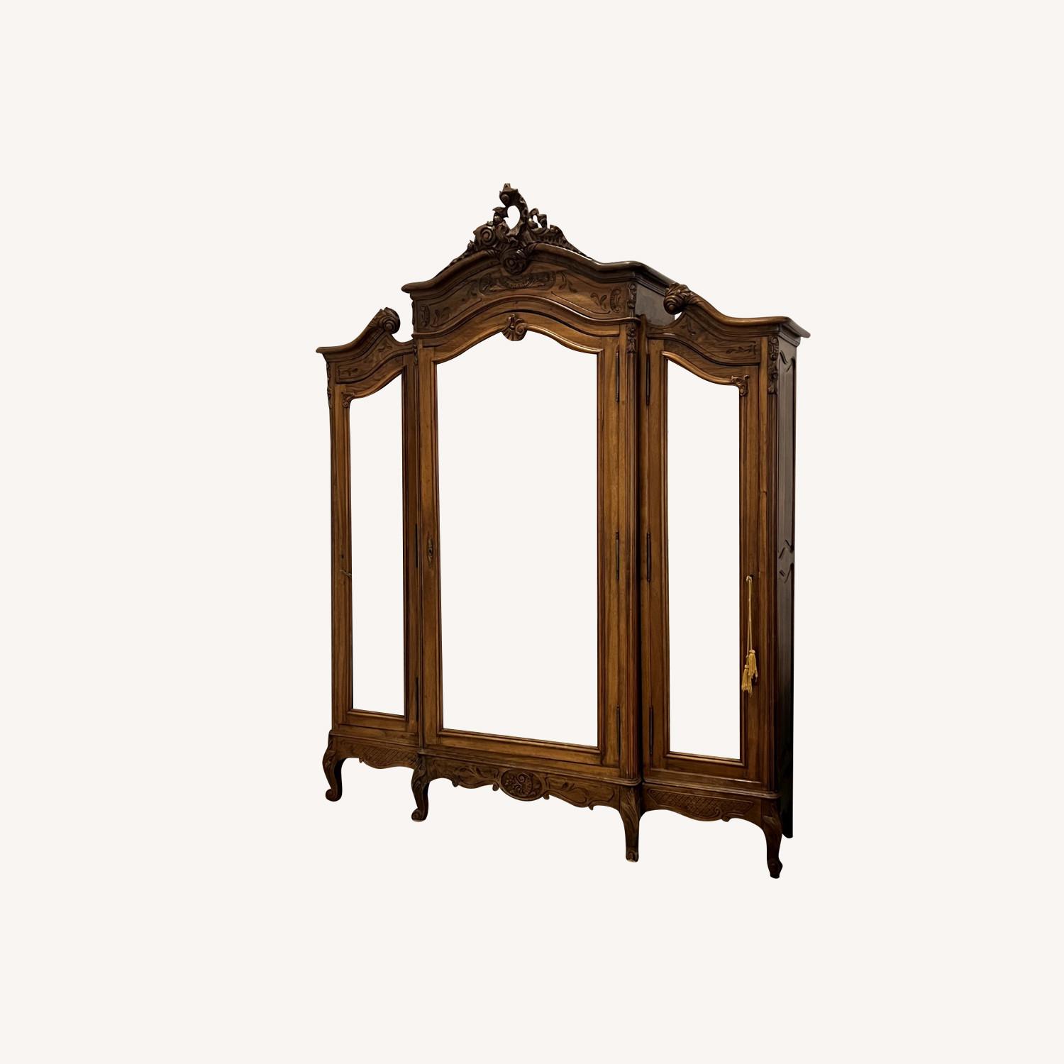 Seller's Notes:French 3 door armoire Louis XV Style Armoire- True quality grand Louis XV style armoire. Handcrafted from solid walnut with original bevelled mirrors. The center cabinet has 5 drawers with shelves above. The 2 sides are shelved, however all sections could easily be changed to suit your needs (can convert to hanging with proper hardware and rods). Beautifully carved cornice, doors with beveled mirrors and relief carvings, stands on short cabriole legs. Very Good condition. Dimensions: Height: 99.0 in.(251 cm) , Width: 80 in. (203 cm), Depth: 20 in.(50.8 cm) We fell in love with this piece over 30 years ago when we moved into our first home where we raised our three boys. All grown up now we have moved on to another location and will no longer have room for this magnificent piece of quality furniture which is so hard to come by these days. Looking for someone to love this armoire as much as we do. UPDATED PICTURES SHOWING: Armoire without the cornice, door lock (needs hardware around lock)