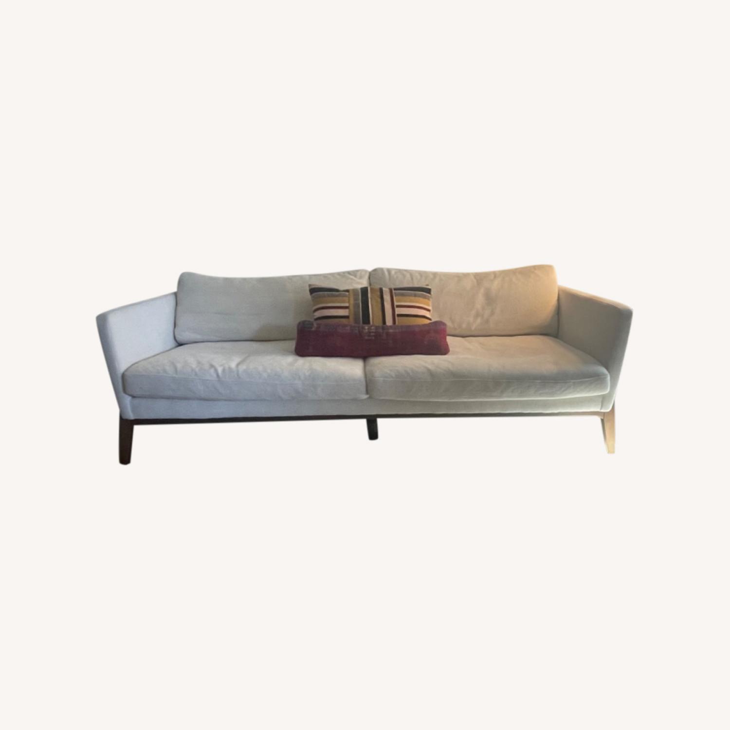 Seller's Notes:This is a beautiful sofa in excellent condition! I’ve owned it less than 1 year in a smoke free, pet free home. Unfortunately I’m moving cross-country and don’t have space for it in my new apartment. The back cushions are down filled and seat cushions are foam wrapped in down - so it is very comfortable. The wood detail wraps around the back as well, so it can be positioned in an open format space too. I love the clean, simple lines - it’ll look great in many styles.