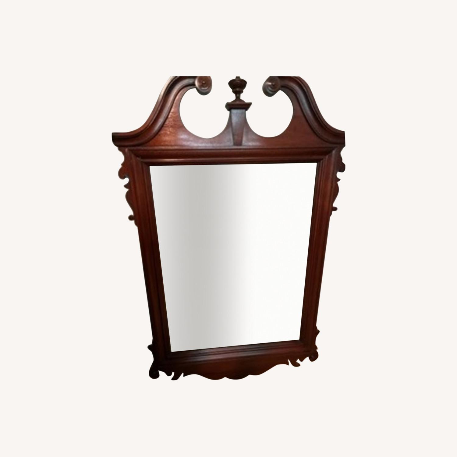 Seller's Notes:A Chippendale style wall mirror, Dixie Furniture Co. Mirror glass, mahogany frame with decorative carving to sides and bottom; pediment top with center finial. Made in the USA, in the late 20th Century. Excellent condition . No flaws to glass. Structurally sound and sturdy.