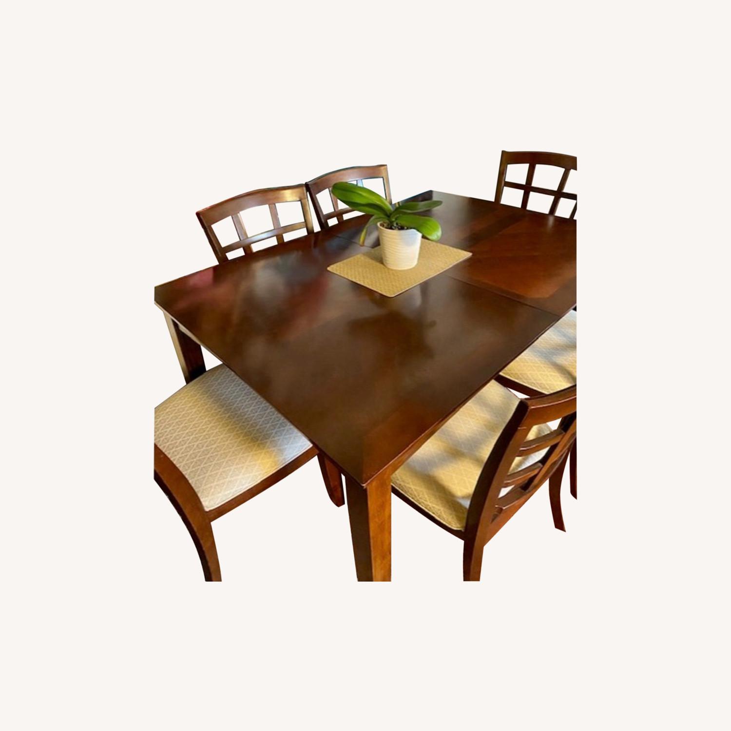 Seller's Notes:Only reason for selling is we're redecorating and must make room for new furniture arriving early next week. Available immediately! Highly discounted to account for you making your own pick-up arrangements. Mahogany dining table (with internal butterfly leaf) + 6 matching mahogany upholstered chairs Table dimensions: Length 71.5 (with leaf), 59.5 inches (without leaf), Width 42 inches, Height 30 inches Condition – good, only owner (it's been loved, just want to find it a good home), no major scratched or nicks in wood, no snags or stains on chair cushions. Chairs barely used and cushions like-new. Original price of chairs alone: $200 each