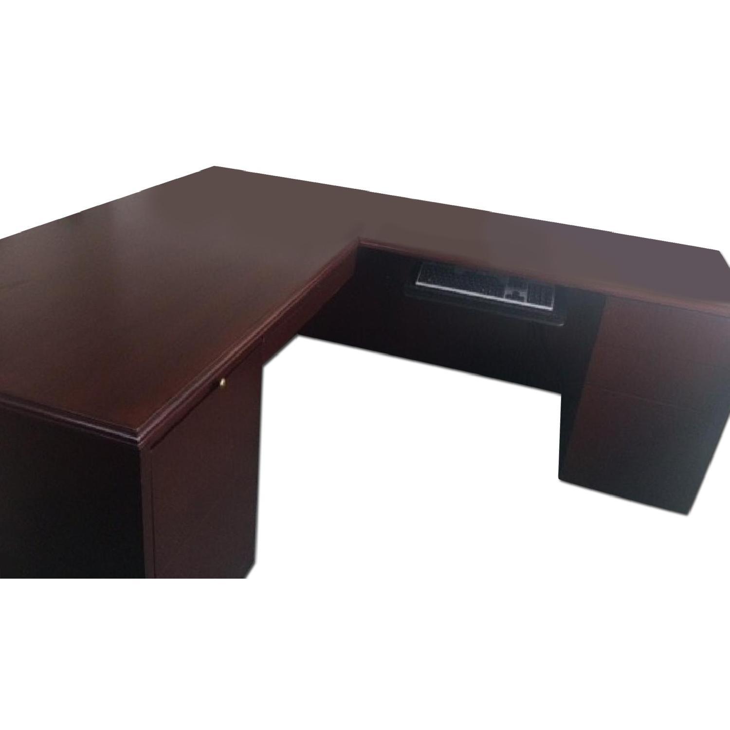Seller's Notes:The desk May be used alone - 72 in. Long x 30 in. High x 36 in. Deep. The return can be attached by brackets included - 48 in. Long x 30 in. High x 24 in. Deep. When last moved, a small gouge was taken at the seam but I just put a coaster over it... the pull out tray in the picture was a poorly functioning add-on and has been removed. There are three deep file drawers for letter or legal size and two supply drawers. There are two pull out trays; the center drawer of the desk has built in wood amenities - dividers for pens, clips, etc. It has had light use and is in great condition.