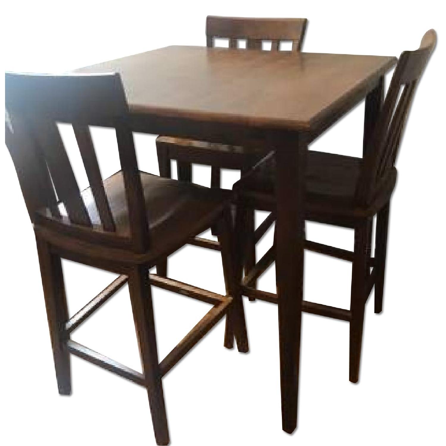 Seller's Notes:My roommates and I are moving into an apartment with an island-style kitchen table, so we no longer need this great dining set. It's a nice cherry stain, four tall chairs and a square table. Table measurements: 38"W x 38"D x 35.7"H Chair measurements: 18"W x 20"D x 40.5"H There is one small dime-sized stain from nail polish remover, but barely noticeable. One chair peg is broken, but we fixed and haven't had any issues. (Not the external wood paneling, the small, internal peg that connects one of the back panels to the top section of the chair. Externally, everything is in perfect shape.)