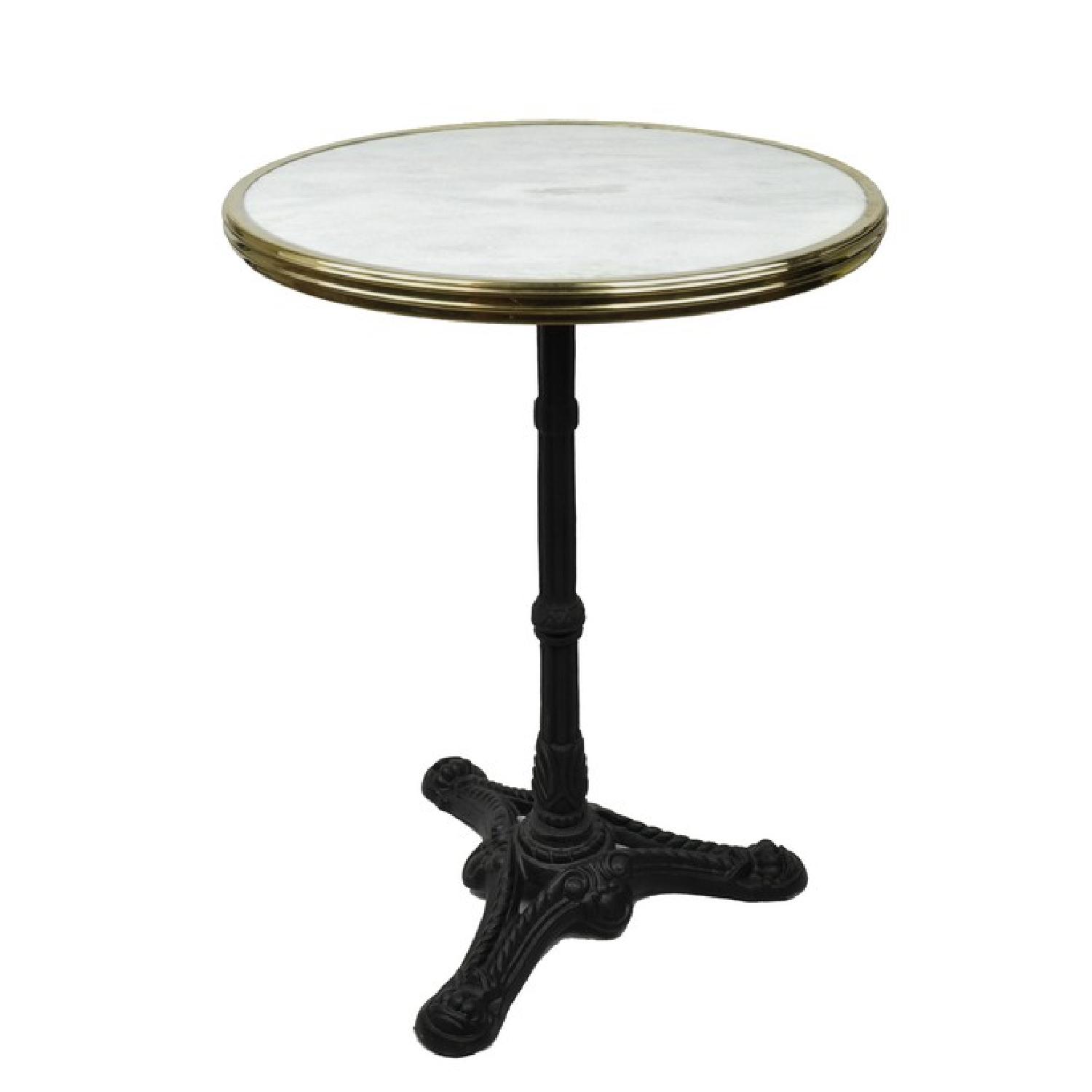 Seller's Notes:Only 3 months young! We bought these picture-perfect tables in September for temporary use in our cafe. Our final bistro tables are coming in from France to replace these tables, and we will no longer need these. Lightly used, mostly to set down coffee, tea and pastries. They're still like new, save for a tiny coffee stain here or there. If they wobble, you simply need to twist the table top securely into place. Happy to send more detailed photos, or to sell at smaller quantities. Cheers! STYLE: BELLE EPOQUE MATERIAL: MARBLE, CAST IRON METAL, BRASS RIM